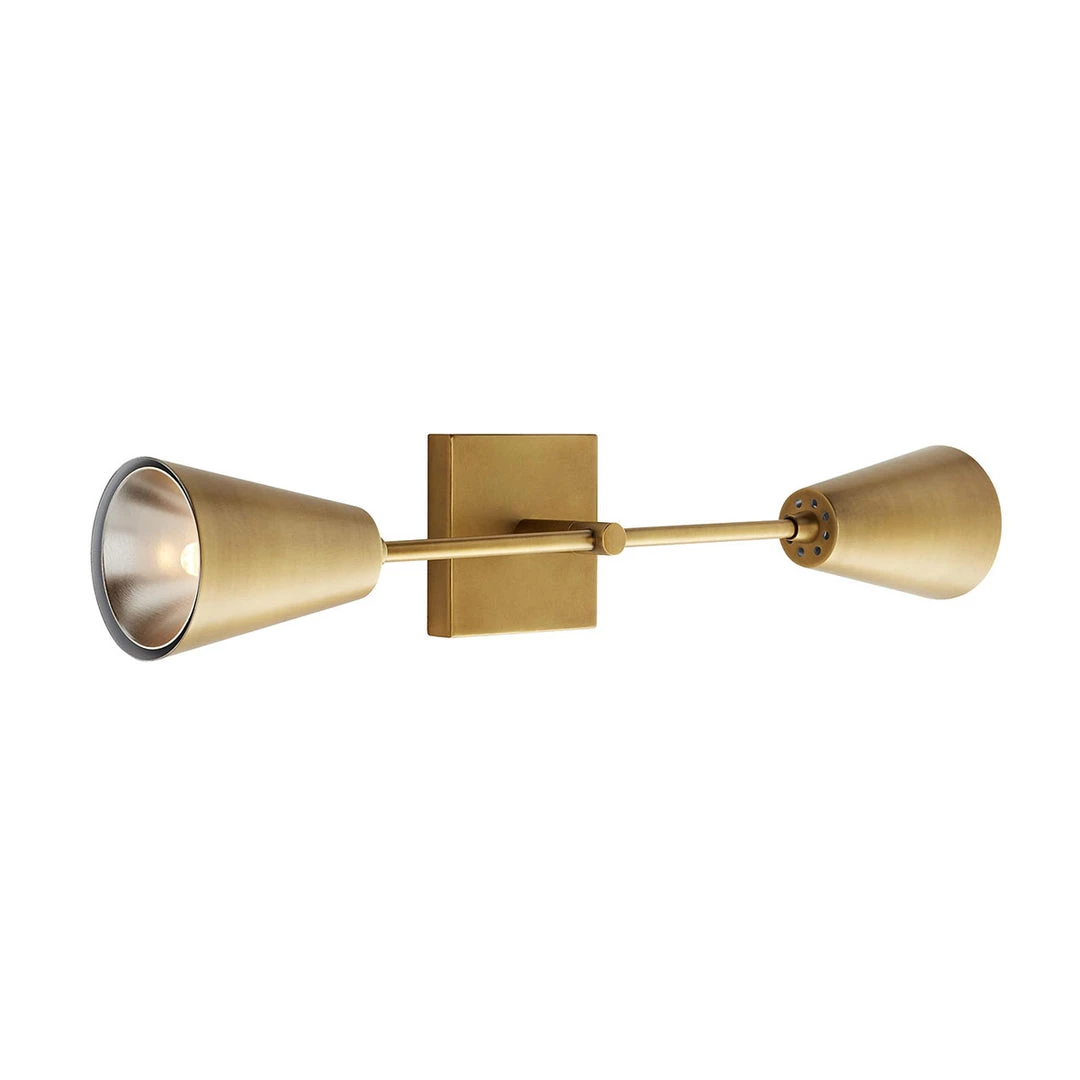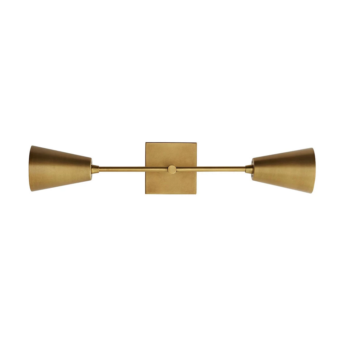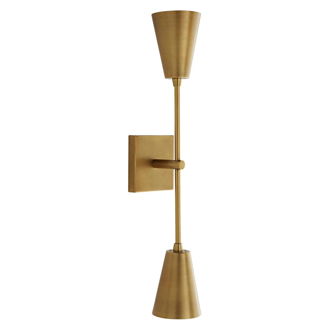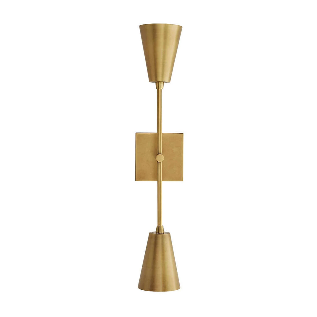 The Kona Wall Sconce is moody and dramatic with a vertically symmetrical design. Two conical lamps sit on either end of a central antique brass rod. From these shades, the light is cast both upwards and downward. The interior of the lamps are lined with matching antique brass metal making this lamp safe to touch when turned on.