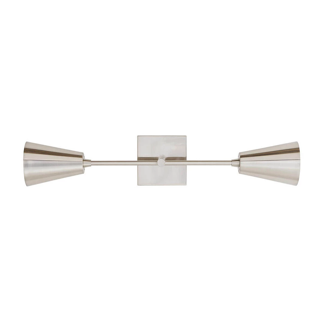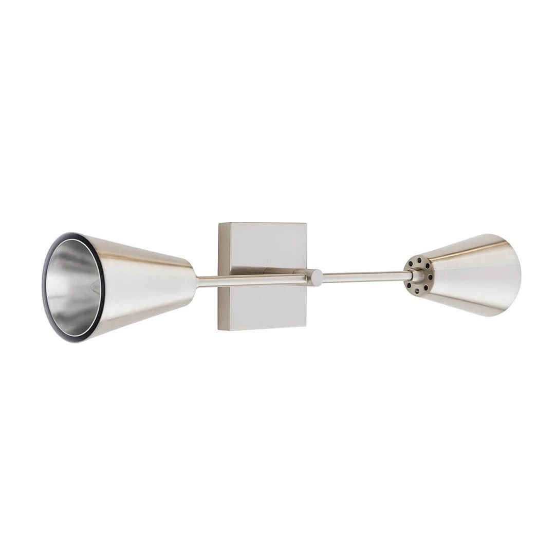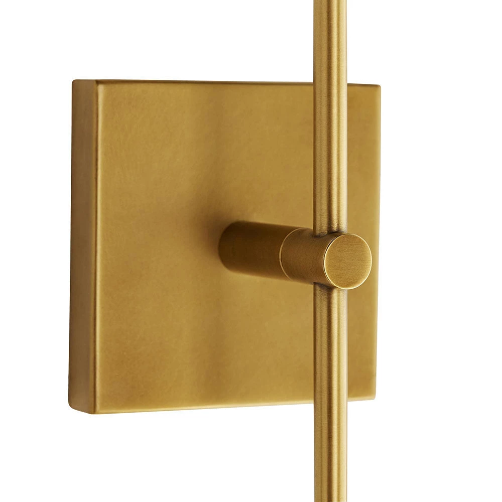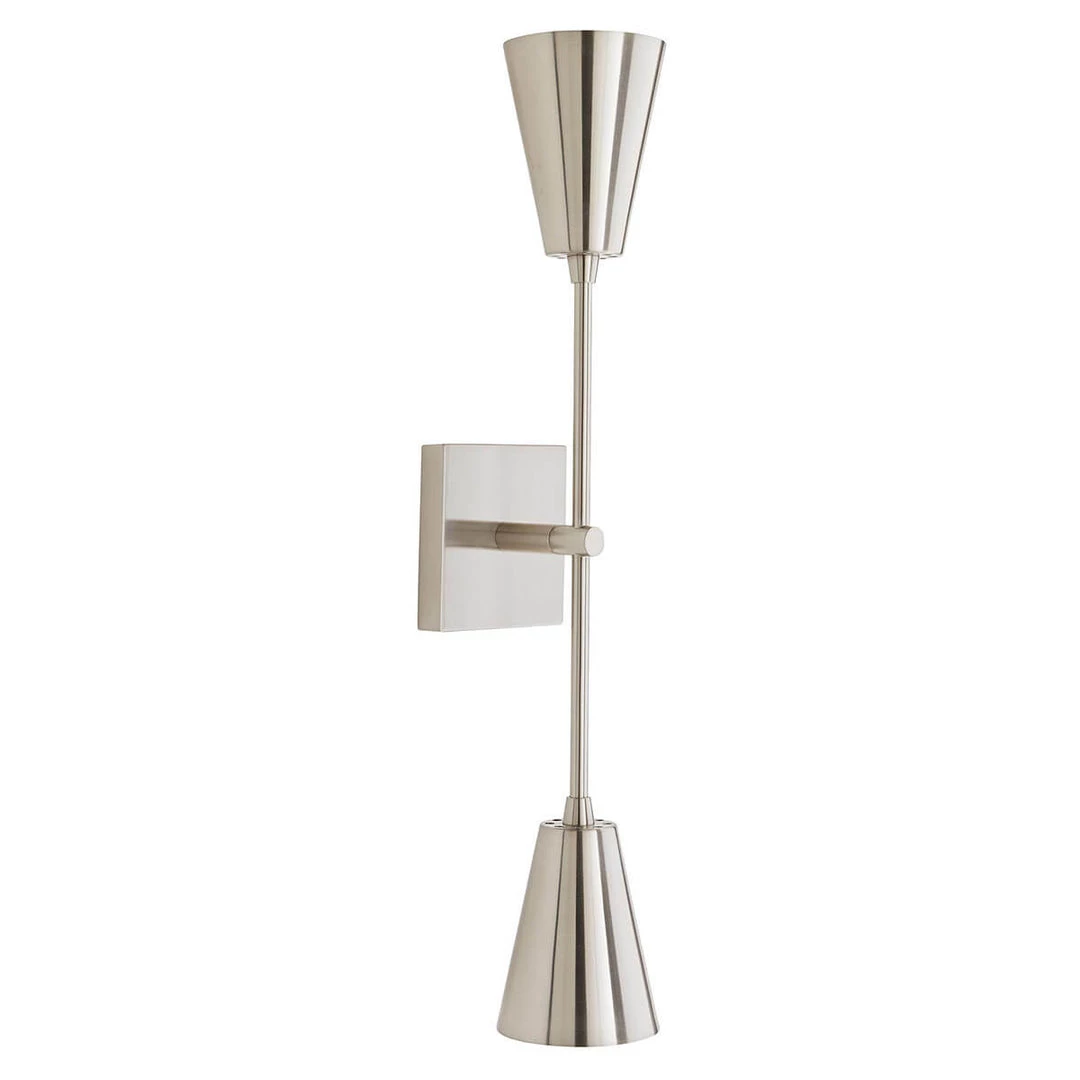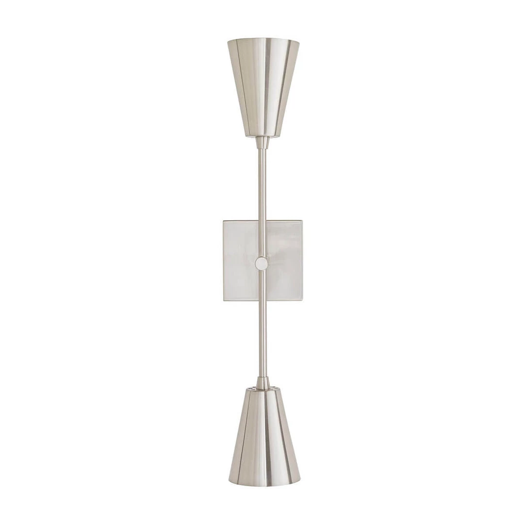 The Kona Wall Sconce is moody and dramatic with a vertically symmetrical design. Two conical lamps sit on either end of a central antique brass rod. From these shades, the light is cast both upwards and downward. The interior of the lamps are lined with matching antique brass metal making this lamp safe to touch when turned on.