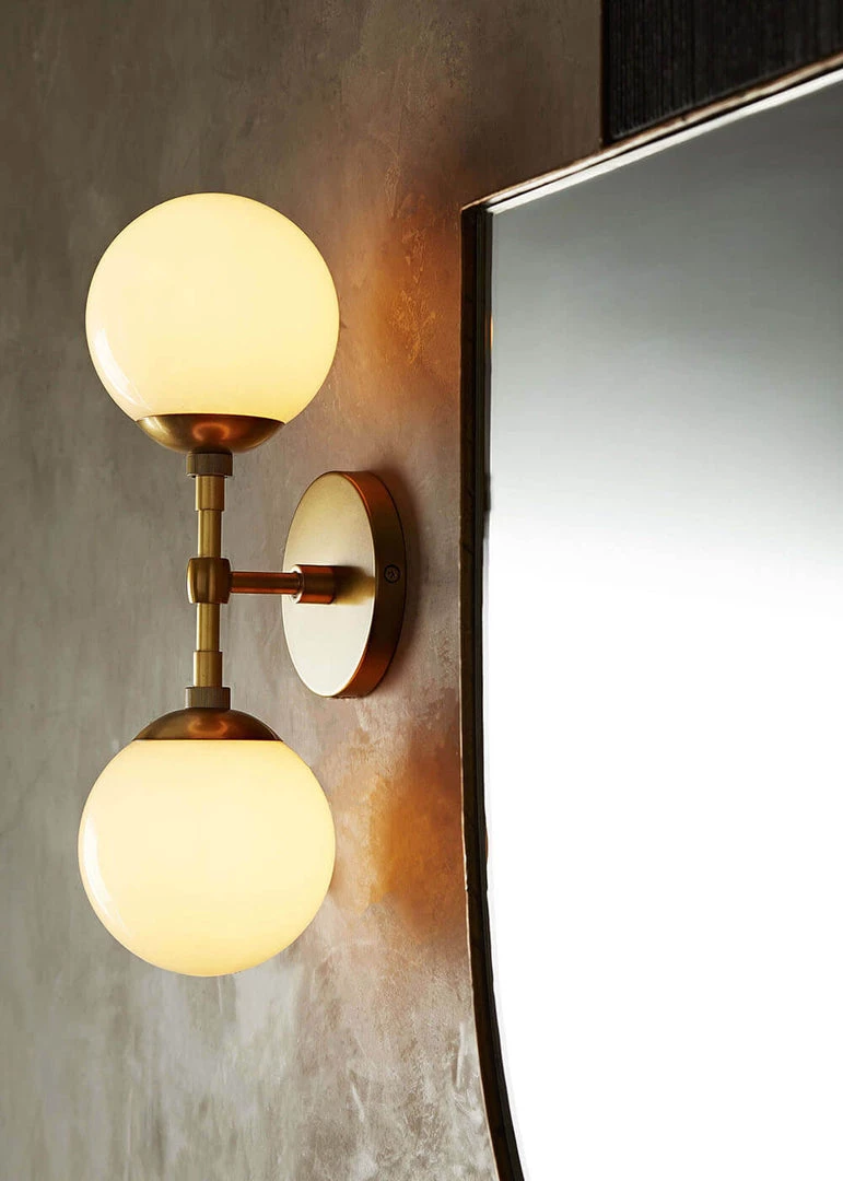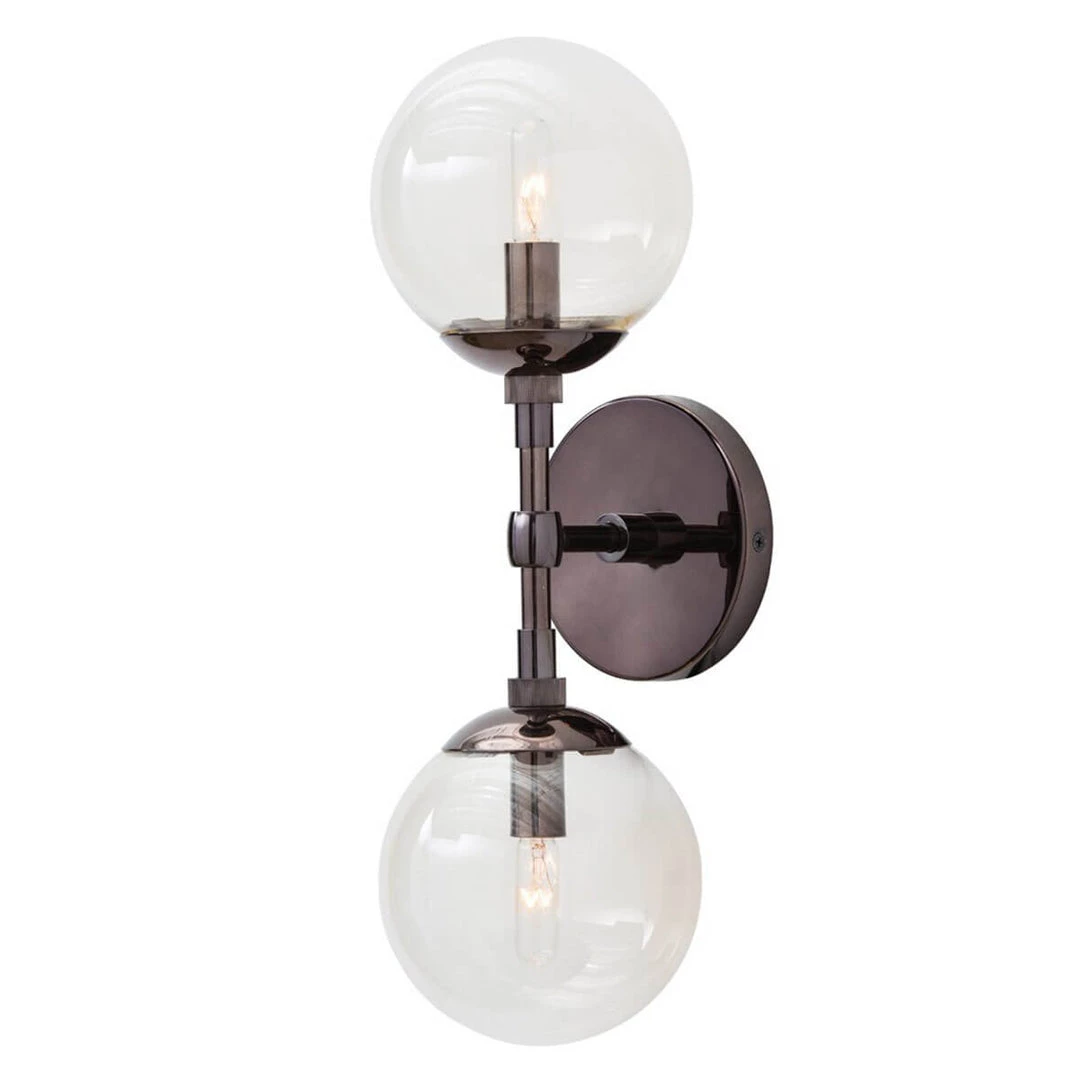 The Navala Wall Sconce is a perfectly balanced double sconce with big glass globes. The proportions are complemented by metal arms and a backplate. This wall sconce can be mounted horizontally or vertically giving you plenty of options for your newly decorated space. The Navala has been rated for use in bathrooms or covered outdoor spaces.