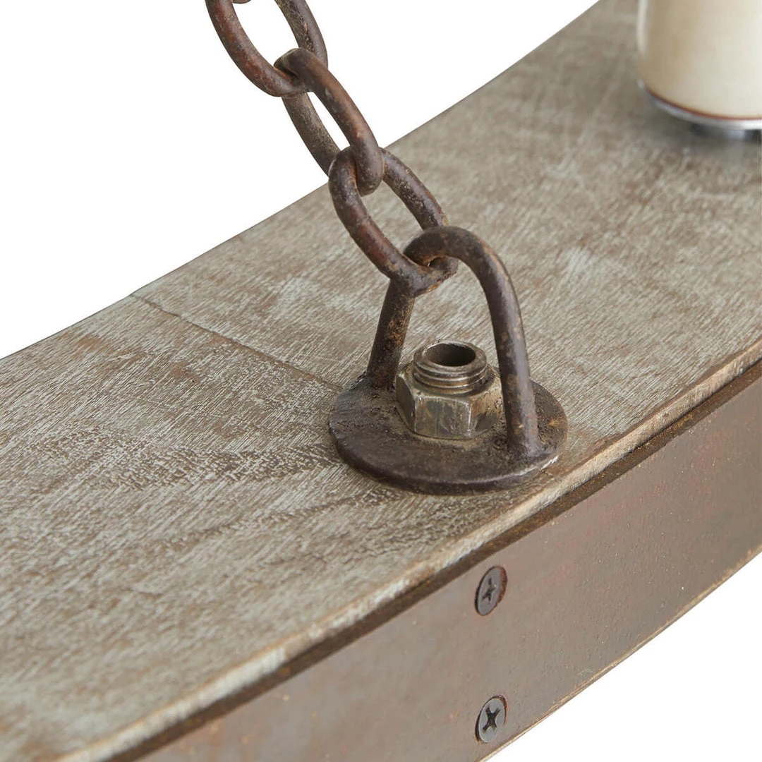 The Valencia Chandelier is a beautiful rendition of the classic wagon-wheel chandelier. This fixture is crafted from a ring of dark grey wood, holding evenly spaced lights. The rustic ring is suspended by a deliberately rusted iron chain.