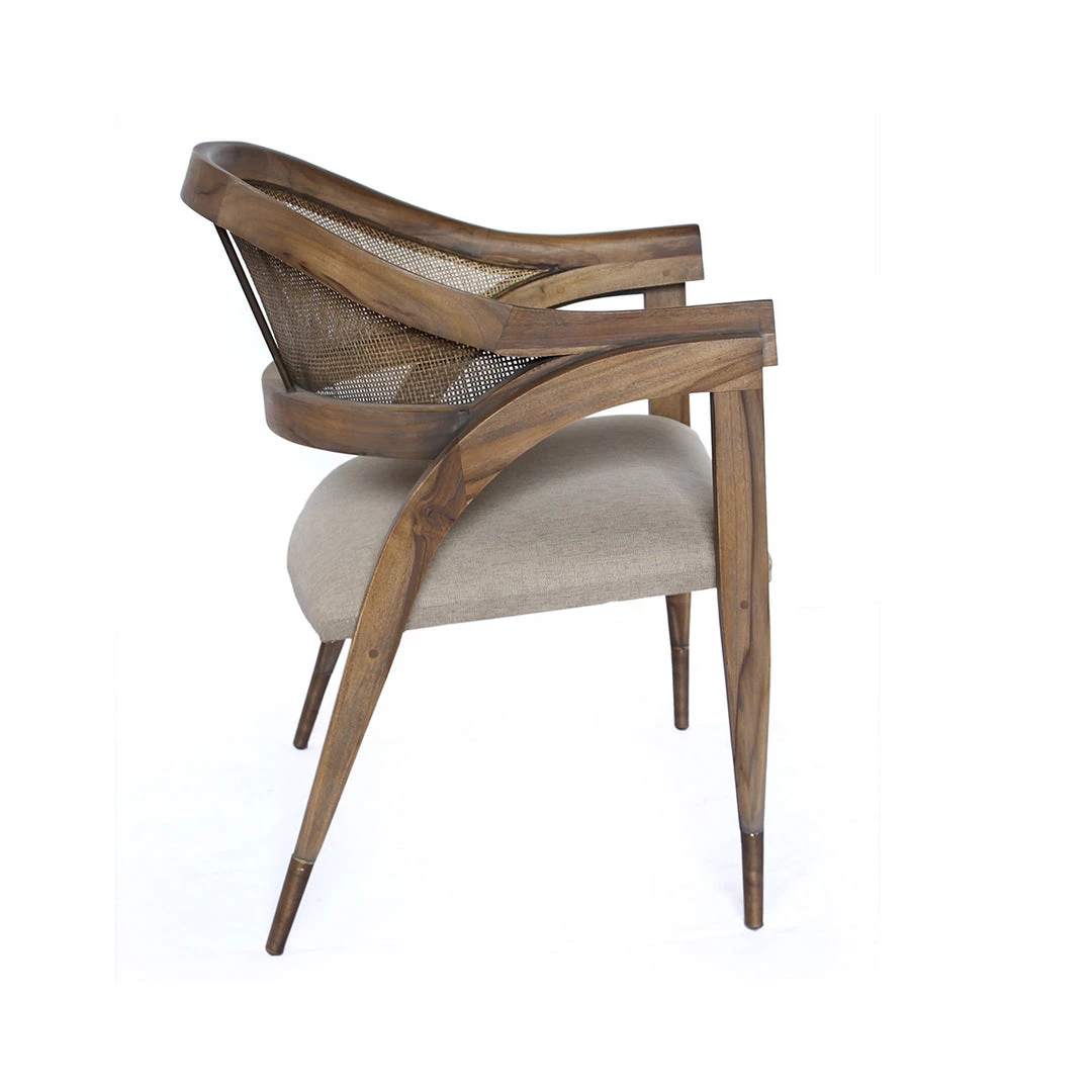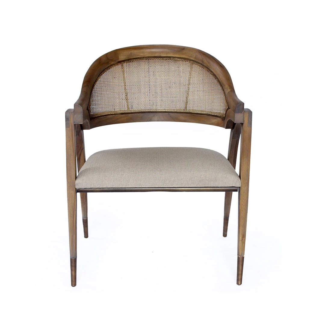 The Delmore Chair has a classical form that resembles a vintage chair, with classical charm and rustic touches. The arms and legs are made of solid, brown finished teak wood with a comfortable grey linen upholstered seat.