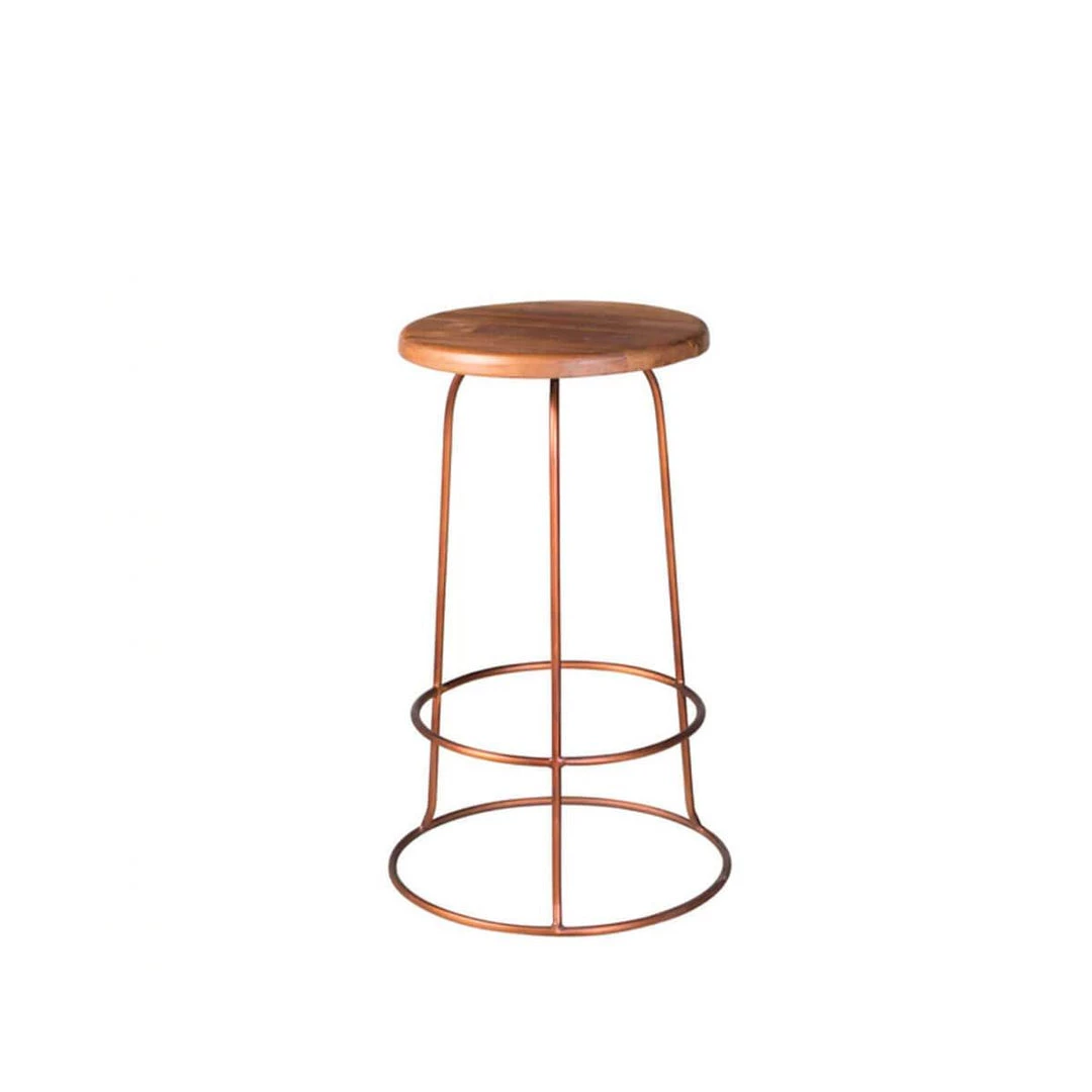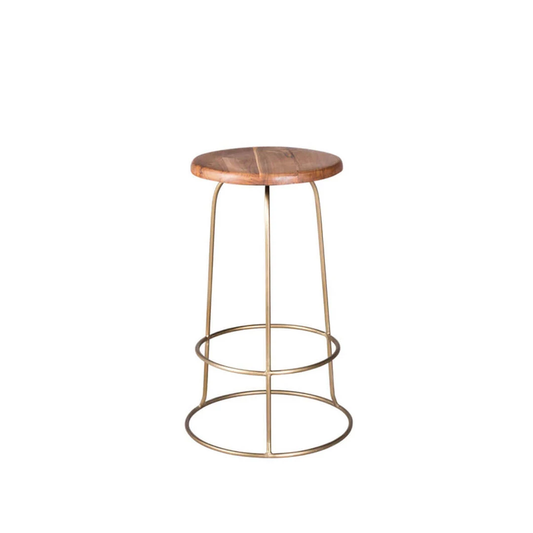 The Conwy Counter Stool suggests a bold pairing of materials with a well-balanced design. The premier aesthetic is adapted from the classic backless stool with updates such as the hand-carved reclaimed teak top and brass or copper finished three-leg base and decorative rings. Due to the construction process, you may see a slight variation in the materials.