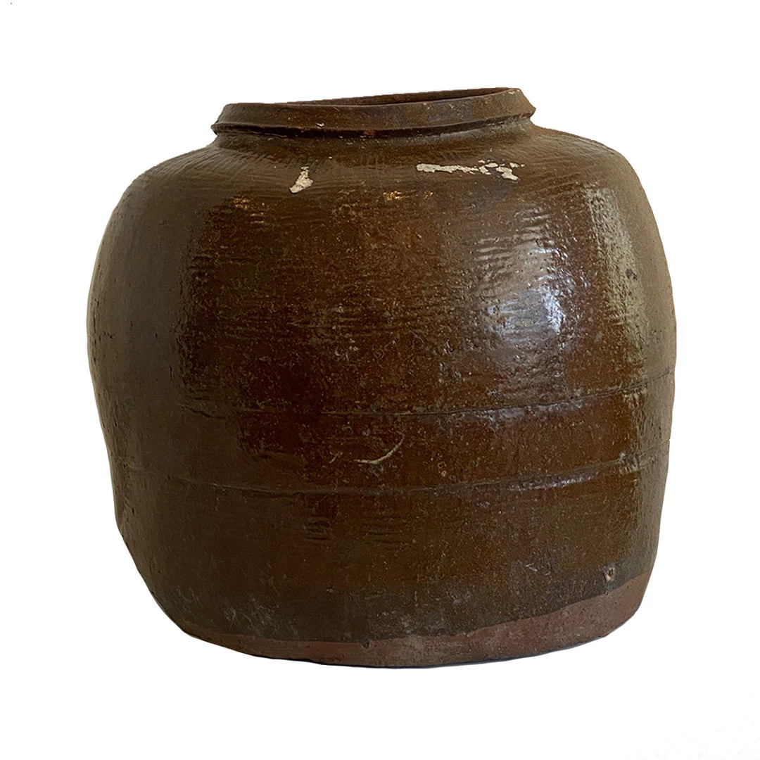 A commonplace item in the Chinese countryside, Chinese Storage Jars are used for a variety of functional uses. Handcrafted and age-worn, each jar is unique and antique looking. Vintage Bean Pots are short, round pieces of pottery, that comes in dark brown finishes.  Use vase to display fresh flowers by placing a glass of water at the base of the jar with the flower arrangement within.
