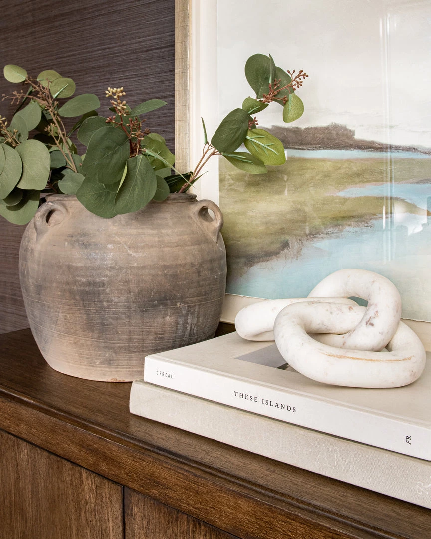 The imperfect façade of the vintage terra cotta Tibet Water Pot adds to the allure of these decorative pots. Each pot has four small looped handles that would have been used for carrying by hand or by rope. For decorative use today, the Tibet Water Pot makes a bold accent.