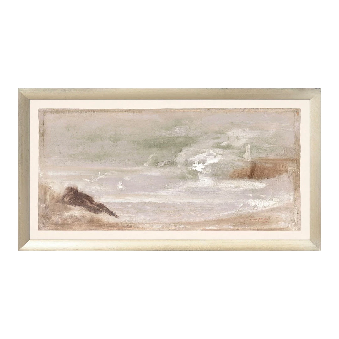 This beautiful representation of a seascape blends vibrant colours of the land and the angry sky with the stark white of crashing waves while still giving a calming effect using warm tones with a beautiful, muted champagne frame.