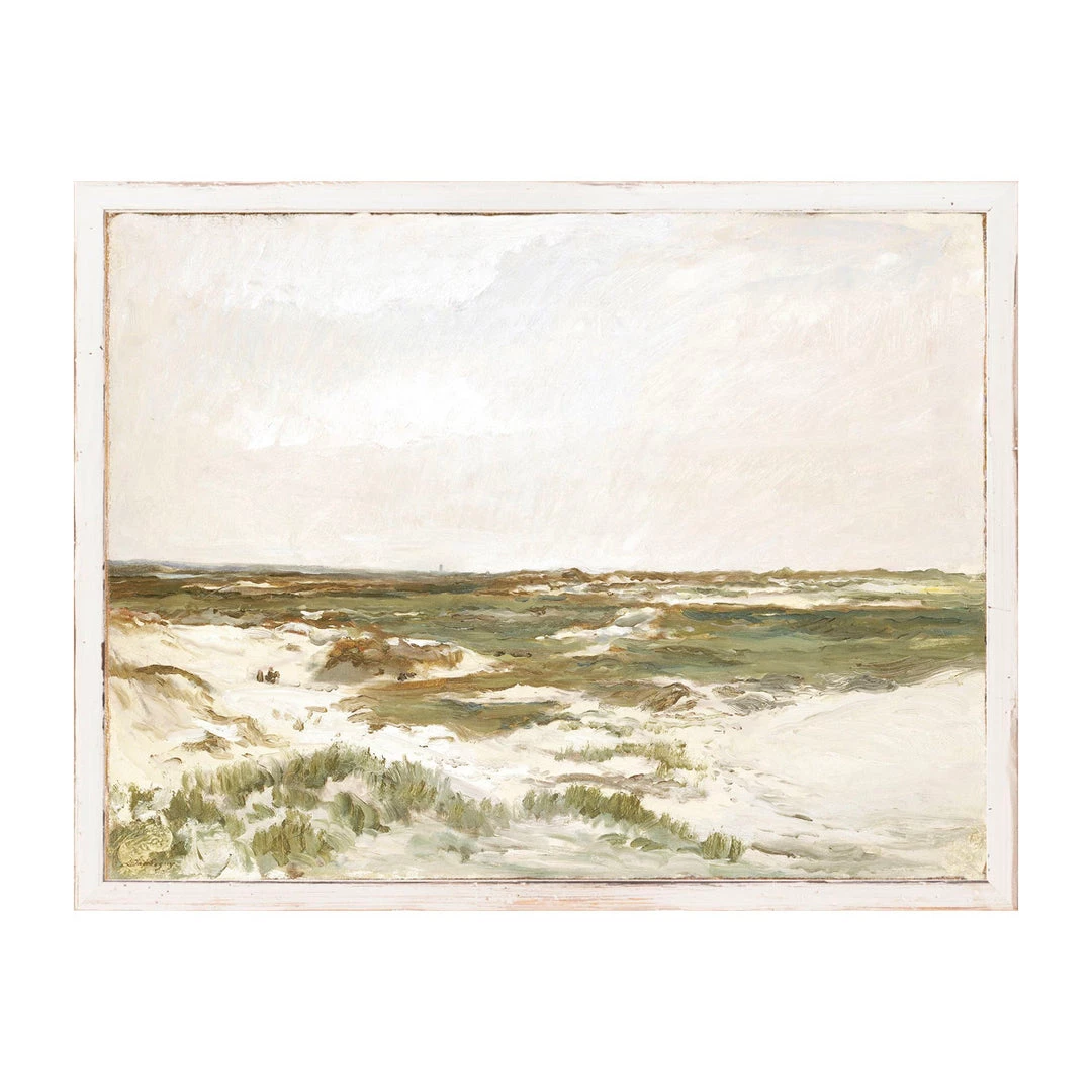 The Dunes features a green-toned replica painting of delicate tones of sage, white, and blue depicting beautiful a scene of sand dunes.Â