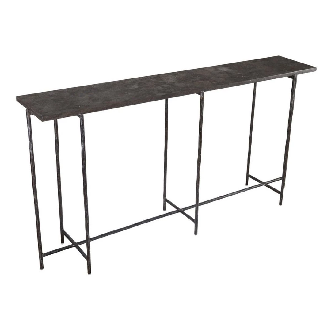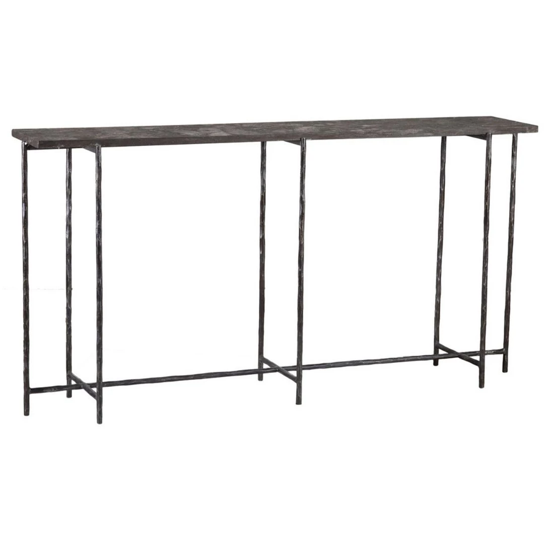 The South Barrington Console Table is a simple yet industrial console design. With its slender iron frame and blue stone top, this simple silhouette adds an industrial feel to your space. Also available in a smaller 35″W size.