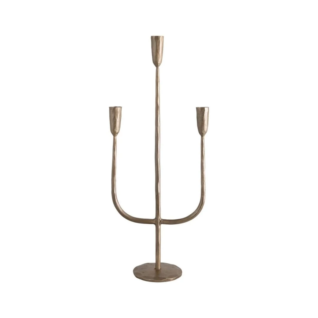 The Cottingham Candle Holder has a beautifully elegant and traditional look with its curved shape for three candles. Made out of metal in an antique brass finish, with hand forged texture, this candelabra is perfect for holding candles in any contemporary or modern living space.