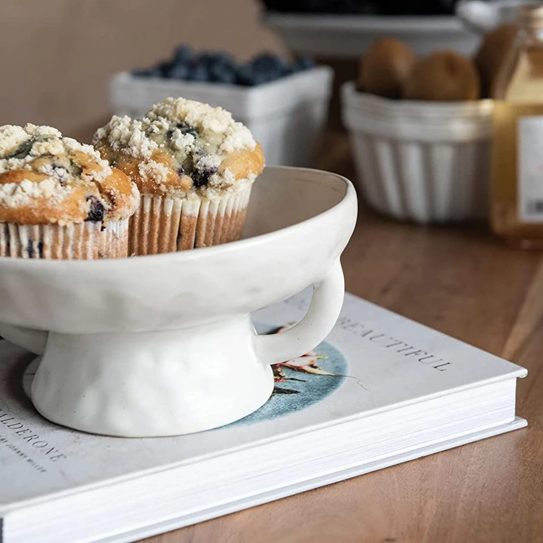 The Osterport Footed Bowl is constructed of stoneware with a matte white glaze for an organic, relaxed look. With its sculptural silhouette this bowl is perfect for serving food, displaying candles, or potting plants.Â