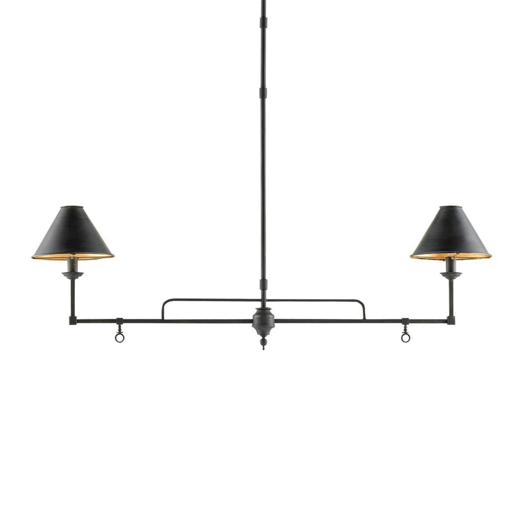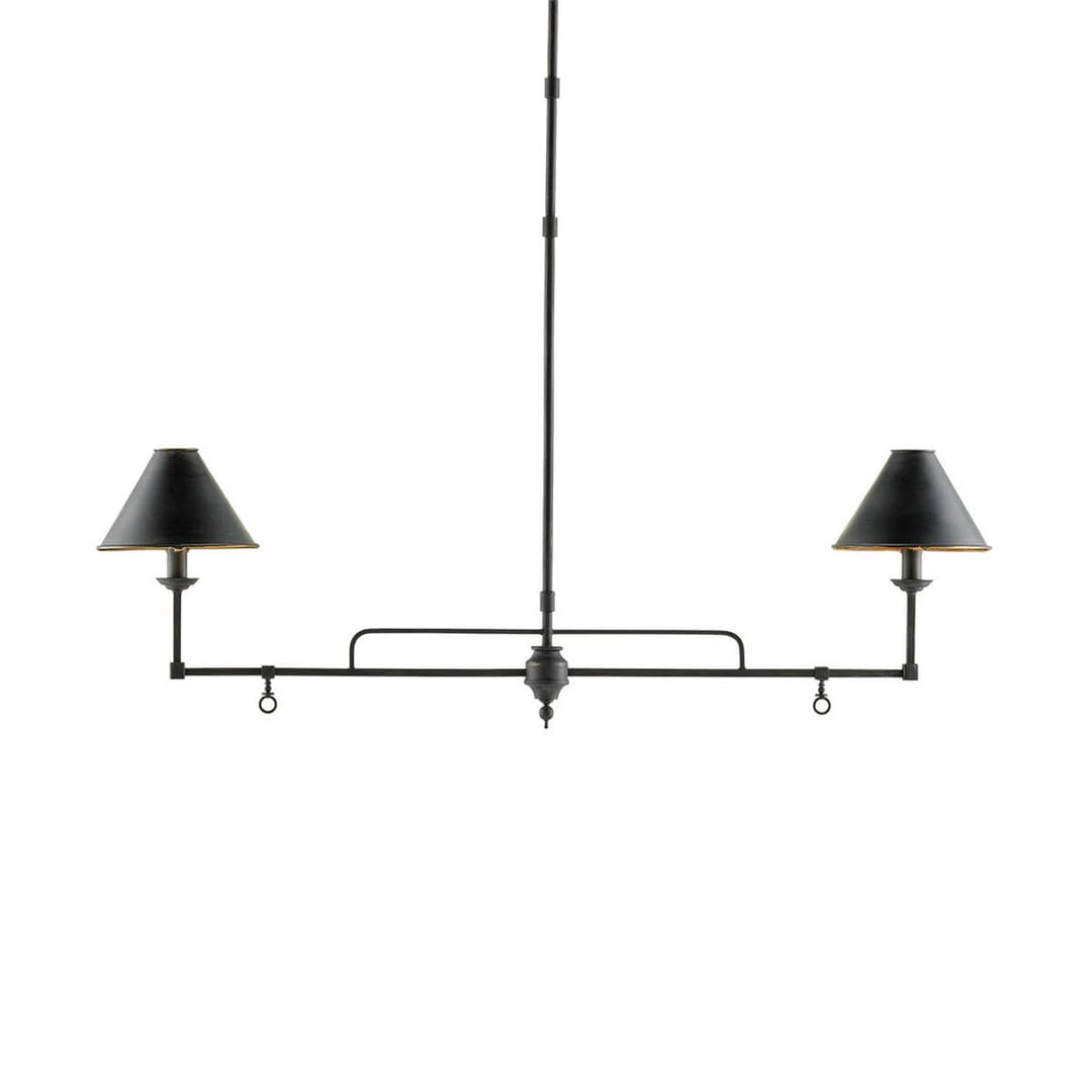 The Nashua Rectangular Chandelier brings a fresh take on the traditional oil lamp to your interior space. The frame has been treated with a French black finish and the interior of each shade is lined with gold leaf. Small embellishments hang from each linear arm adding a hint of detail.