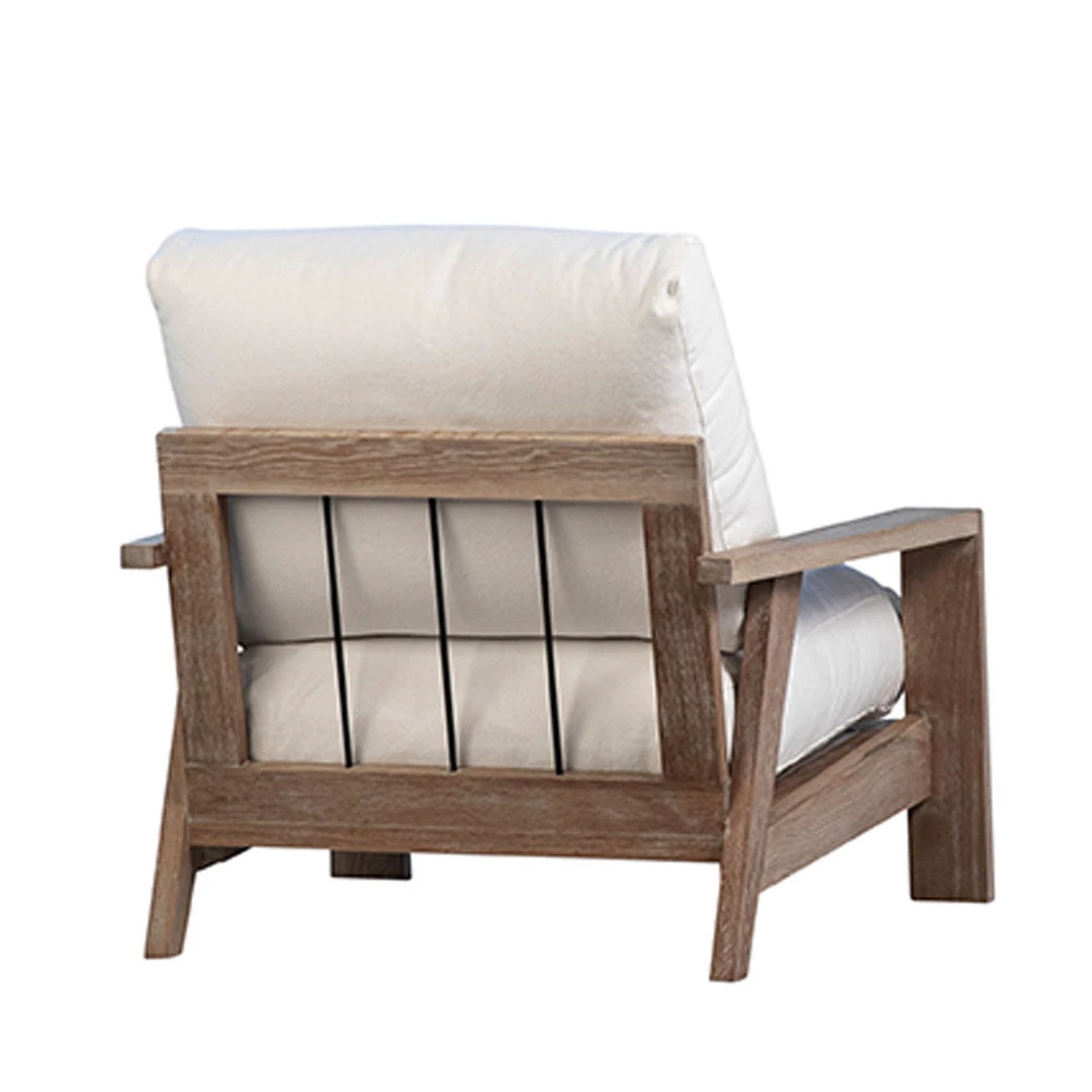 The Chatham Accent Chair takes indoor/outdoor living to a level of luxury. The modern silhouette is inspired by a traditional adirondak design crafted in solid hardwood and finished in a grey wood. The Chatham comes with upholstered seat and back cushions in a performance cotton fabric.