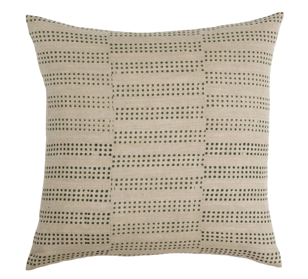 This Gracia Pillow a hand block printed with a linear dot pattern, with cream and olive green tones. This minimal yet inviting design is the perfect addition to any living space.