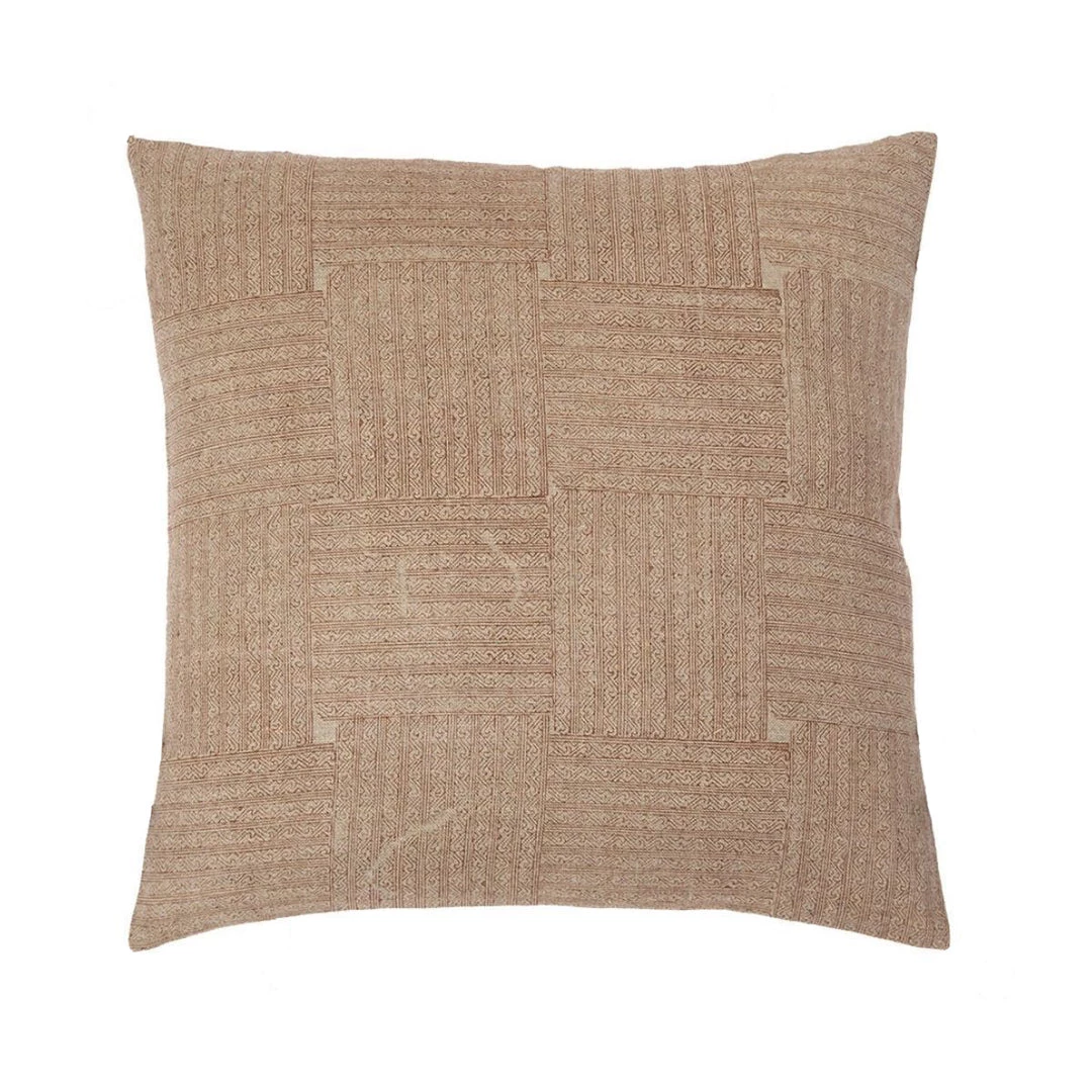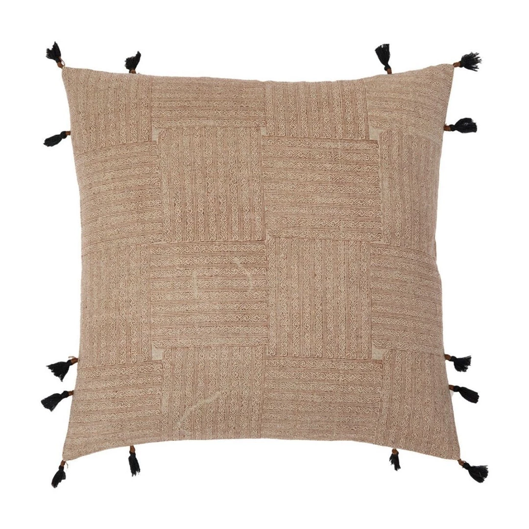 This Nampa Pillow has a hand block print of an intricate inlay design on linen. With its beige tones, rust coloured detail, and optional playful tassels this pillow is the perfect addition to any living space.
