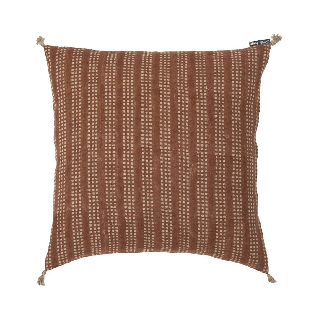 This Villarrica Pillow has a beautiful rust coloured block print, decorated with hand-sewn tassels. This minimal yet warm design is the perfect addition to any living space.