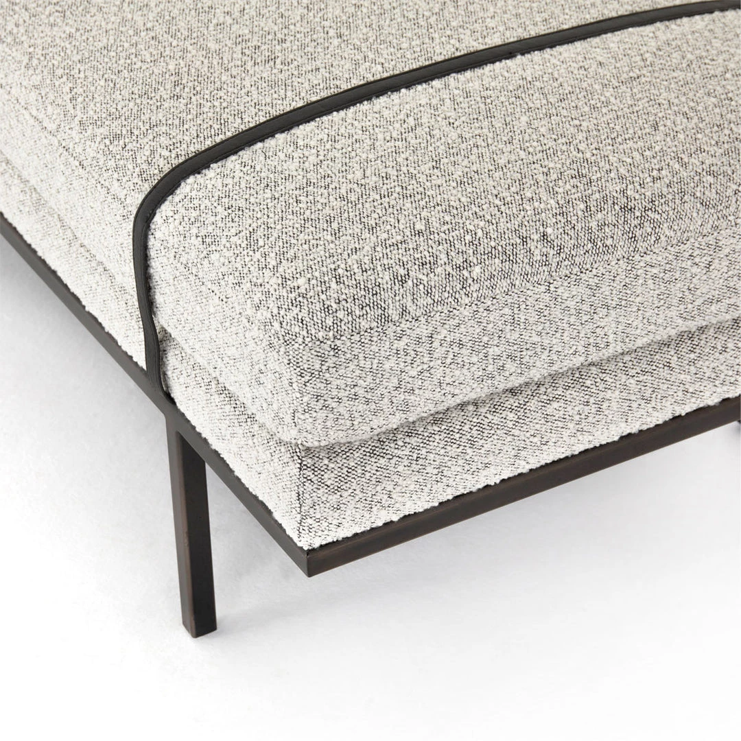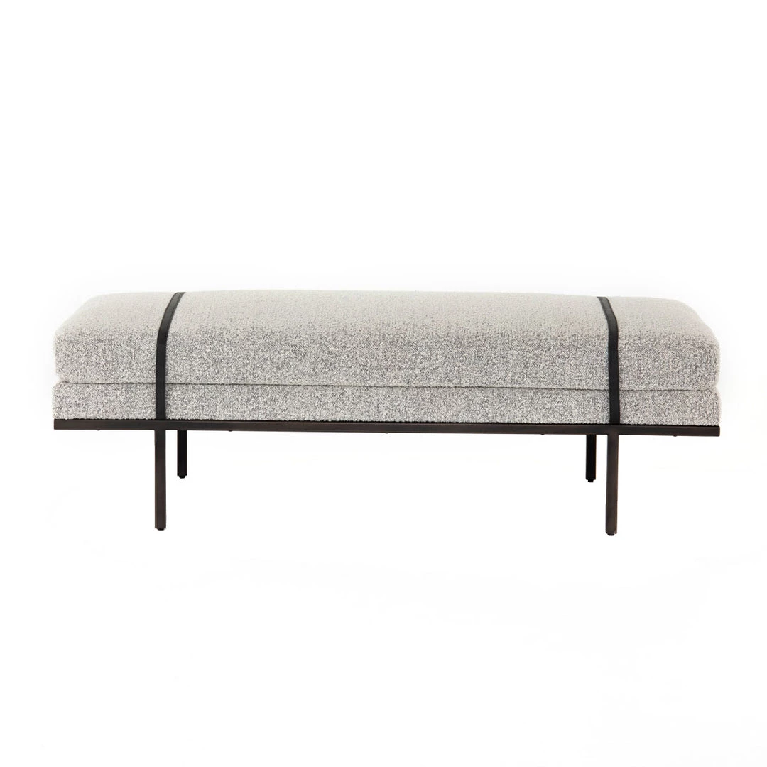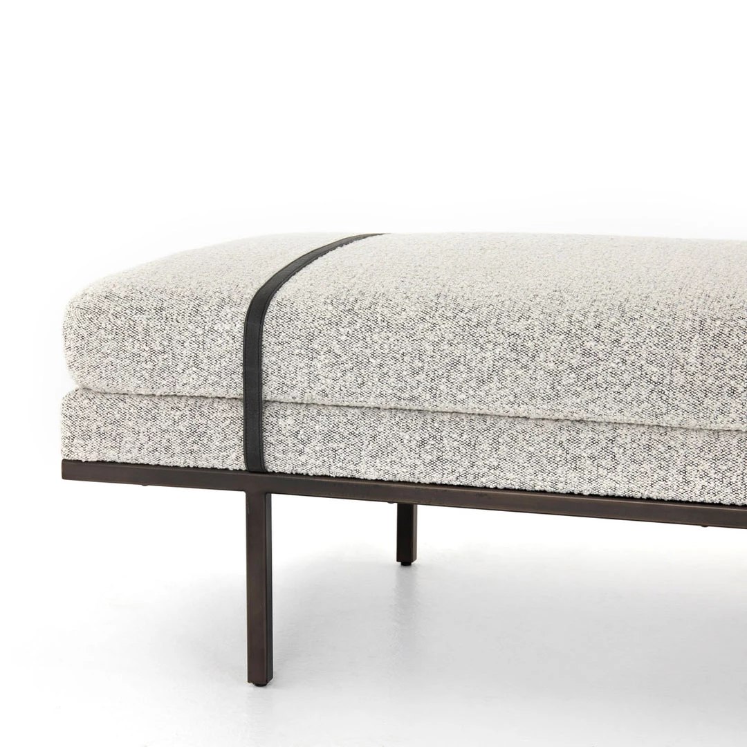 Make a chic statement with the Evandale Bench. Decorative straps of black top-grain leather take chaise-style bench seating to the next level. Airy, elongated legs lend a look of lightness for balance – the perfect piece at the foot of a bed, hallway, or dining space.