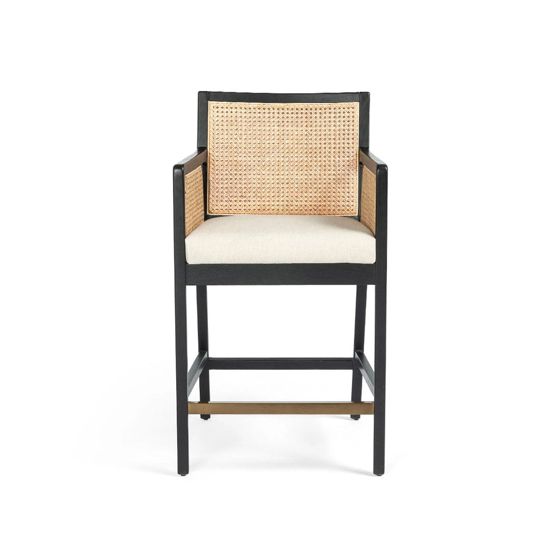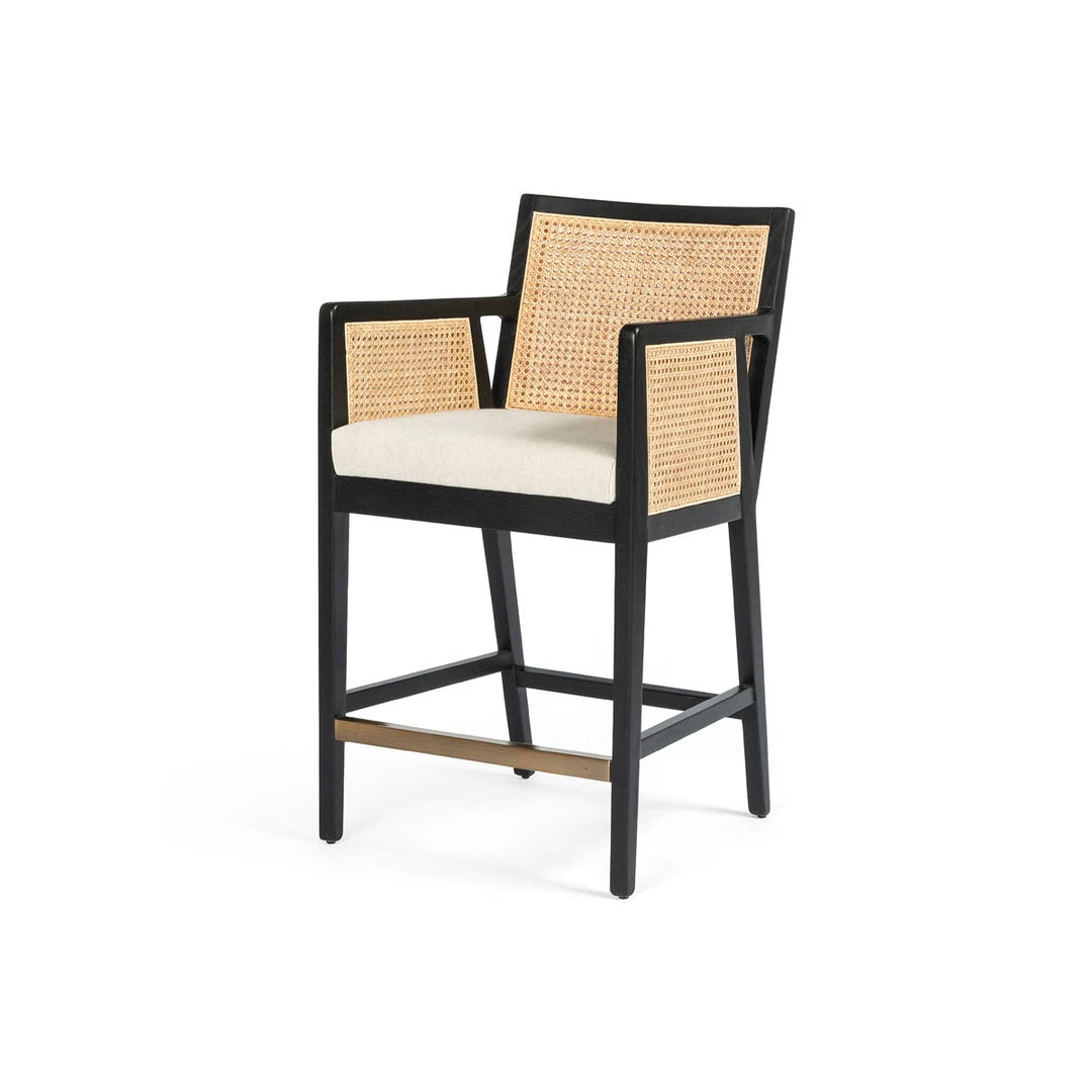 The Celeste Counter Stool is a fresh take on a retro seating style. The brushed ebony nettlewood frames a textural inlay of natural cane, for perfect contrast. Neutral linen-blend seating of high-performance fabric for a modern sensibility.