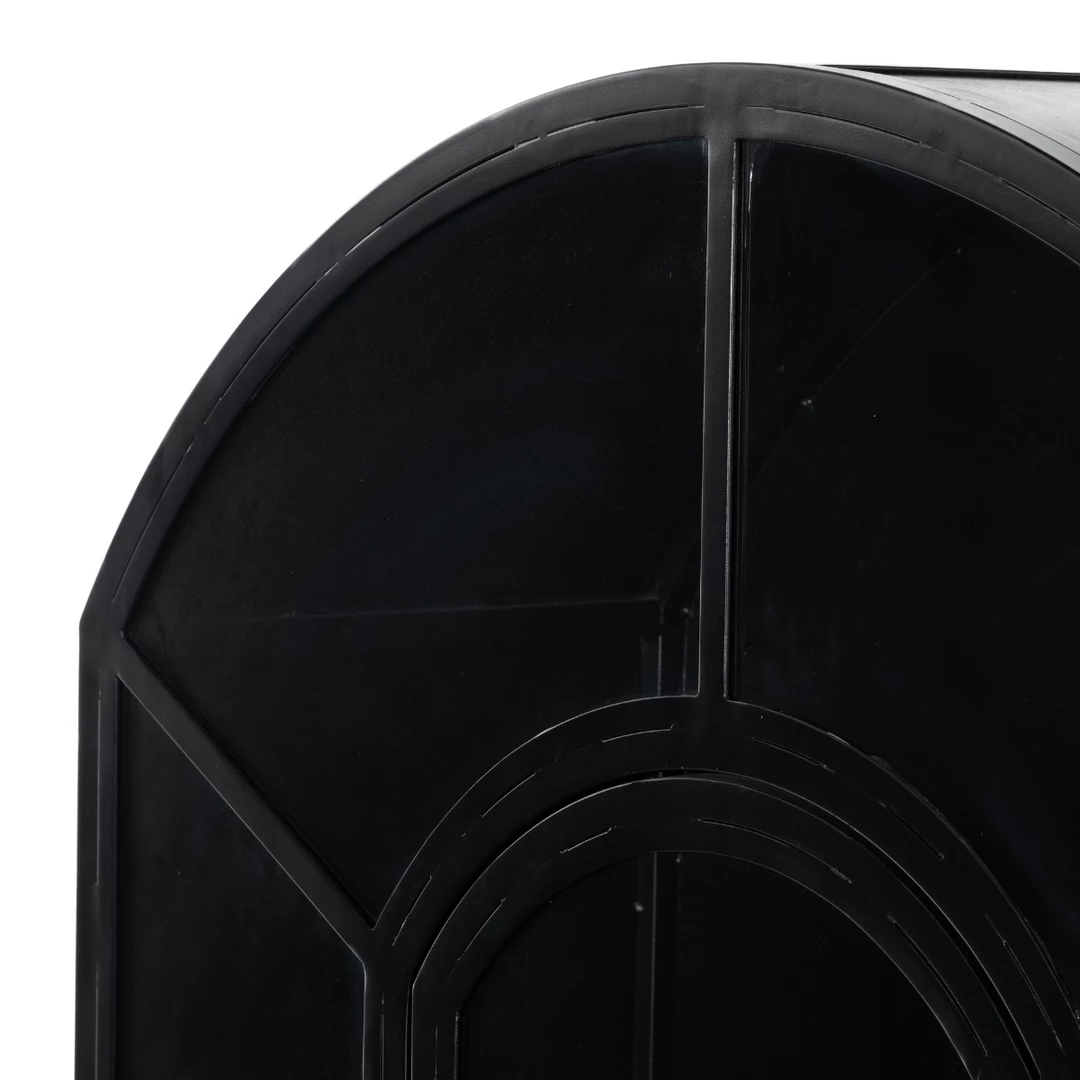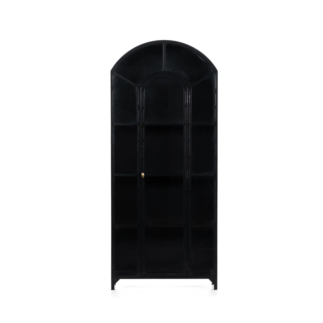 The beautifully arched top and the ability to display your favourite decor, books or precious belongings is what makes the Erlangen Cabinet so special. The solid iron sheeting is coated in a sleek matte black to contrast and confidently display your items.Â