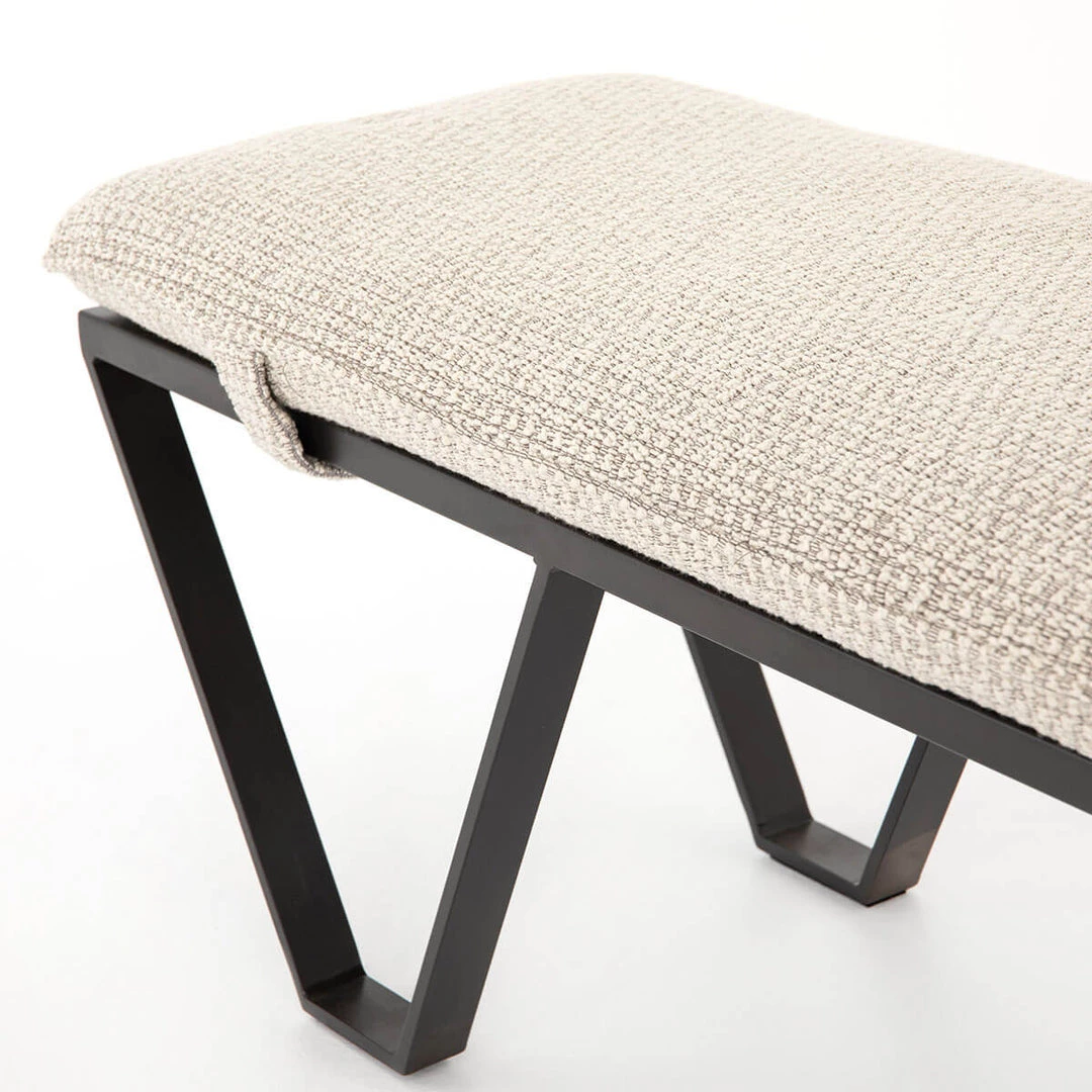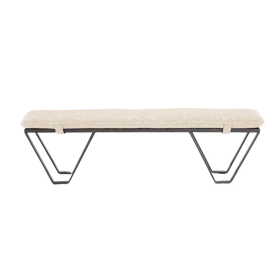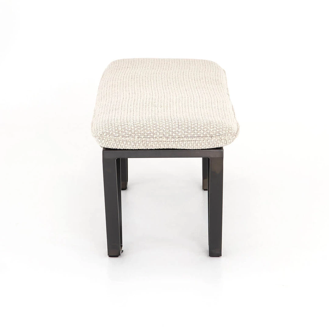 The Montana Bench is a re-imagined ottoman. The cleverly shaped and distressed flatstock iron legs support a minimal yet comfortable cushion in either top-grain umber grey leather or textured oatmeal upholstery.