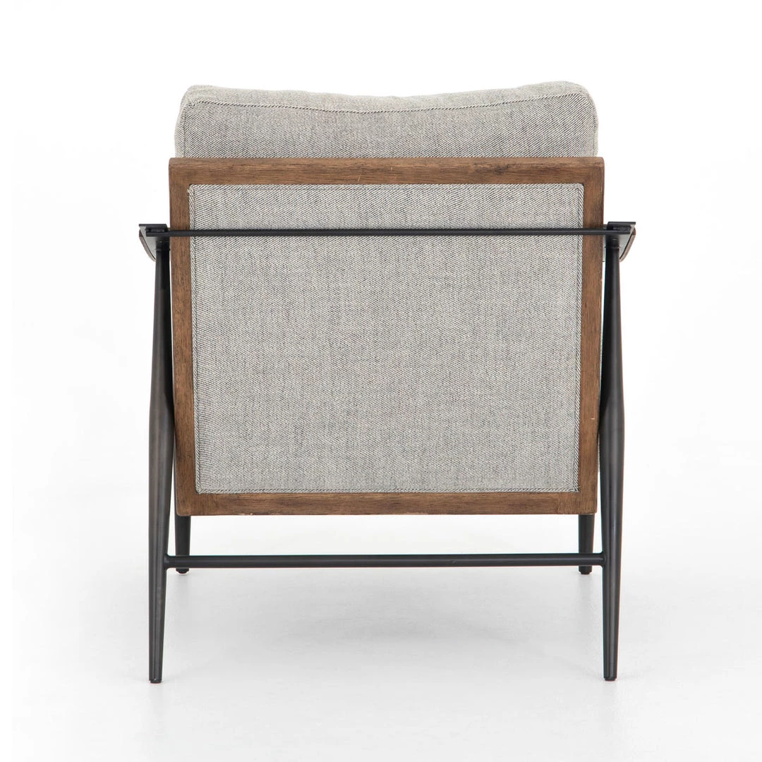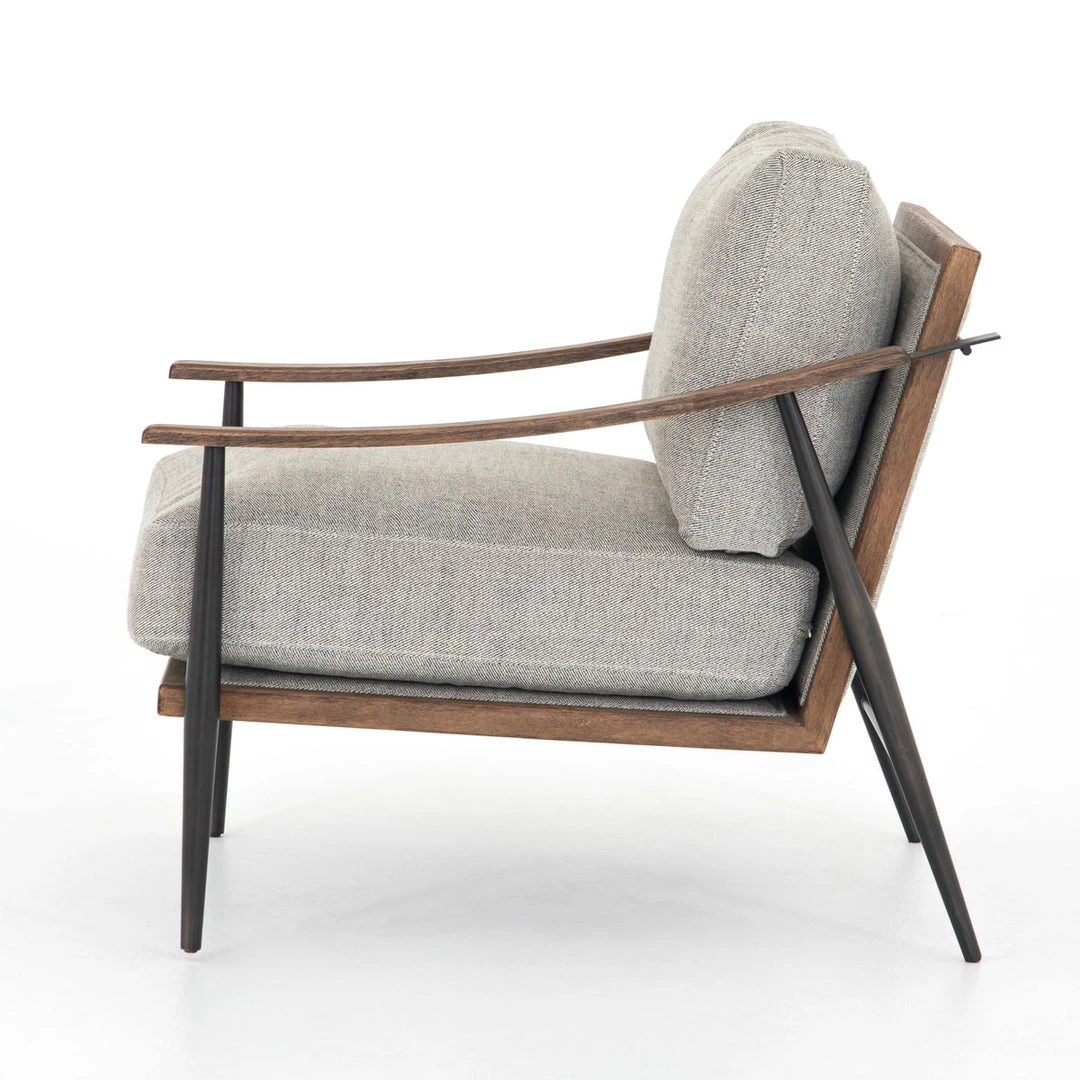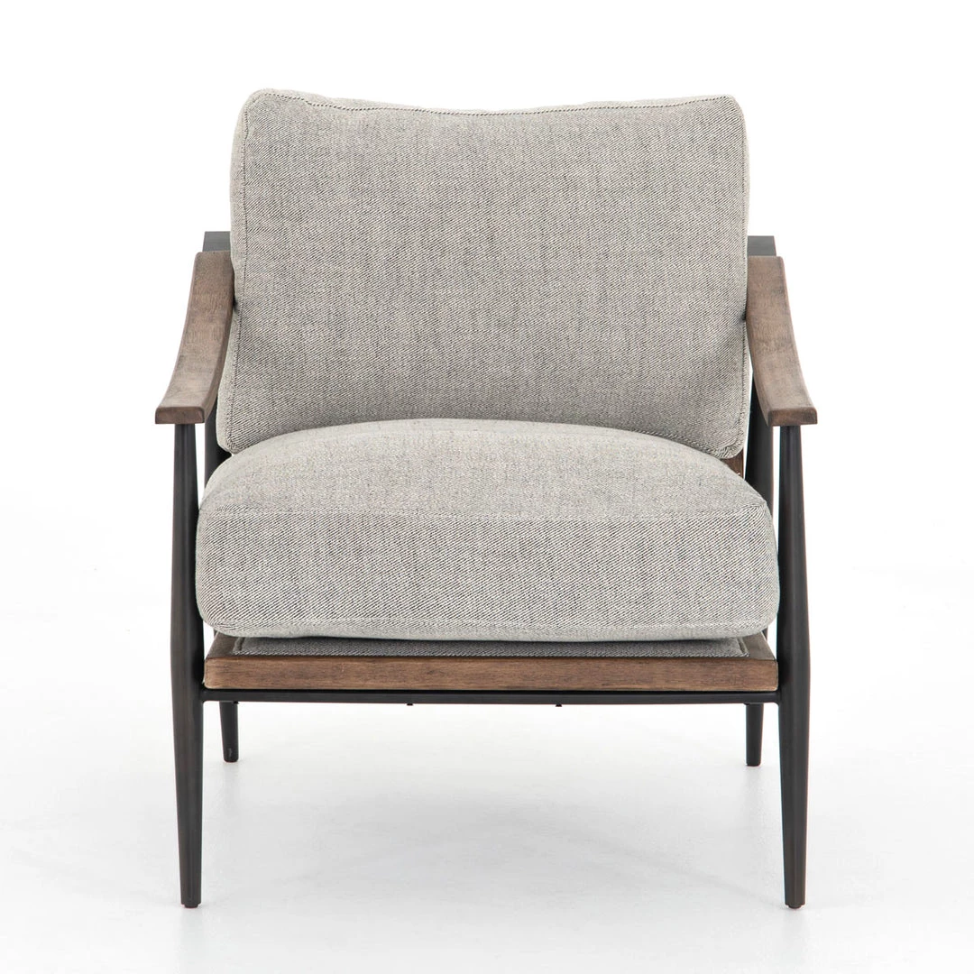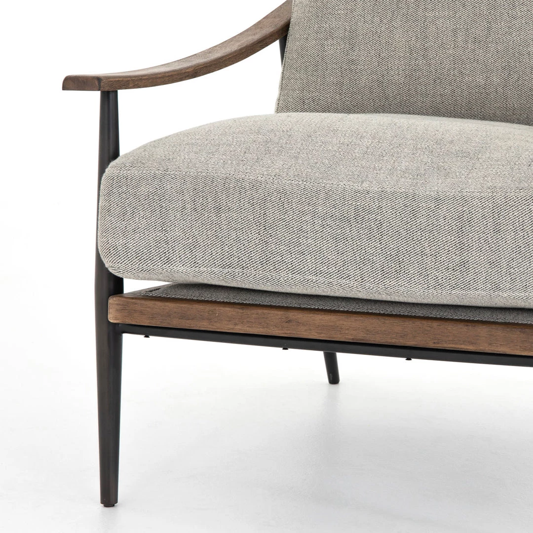 Comfort and class in one chic silhouette. Sloped wooden arms and forged, gunmetal-finished legs frame cushy feather-blend seating covered in a textural grey twill, striking great tonal balance between warm and cool.