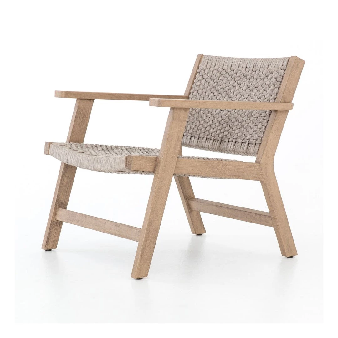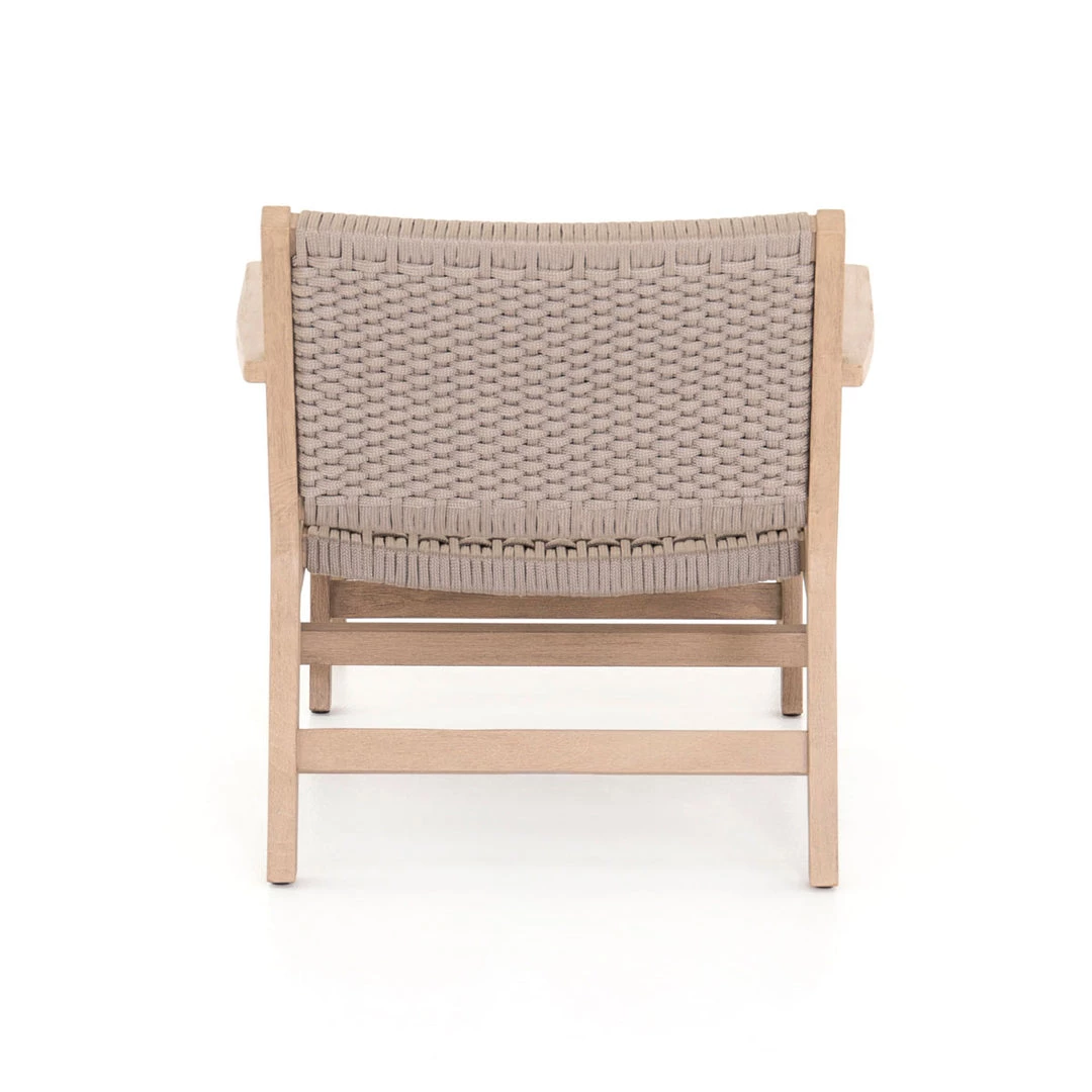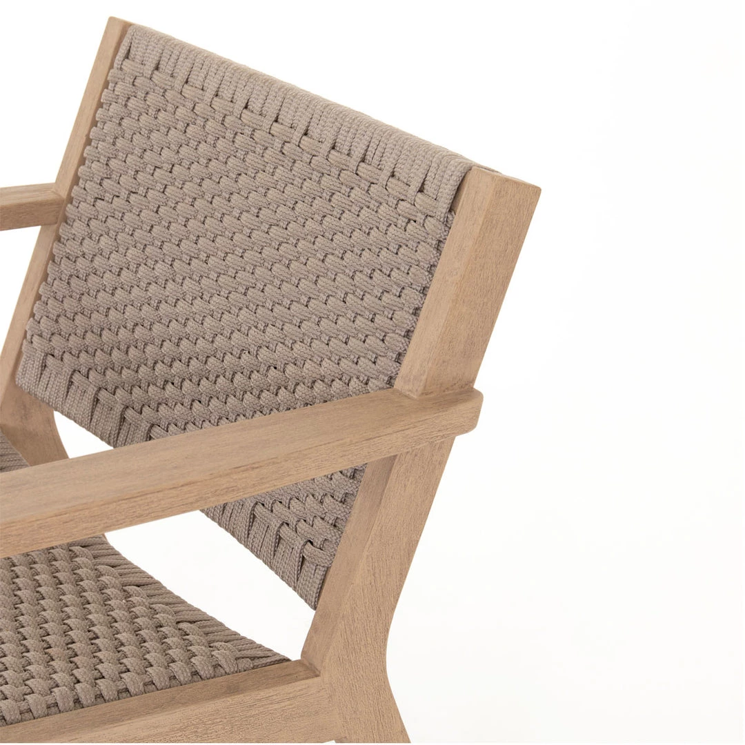 With thick handwoven rope seatting, the Inglewood Chair & Ottoman adds a textured costal look to your outdoor living space. The outdoor chair & ottoman are supported by a light washed, brown teak frame with various angles that add a unqiue flare to any space.