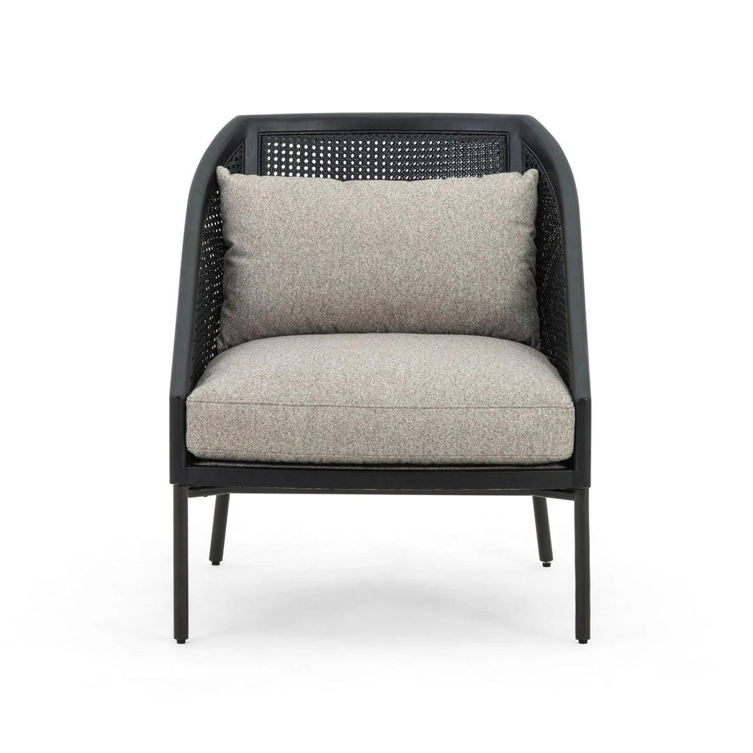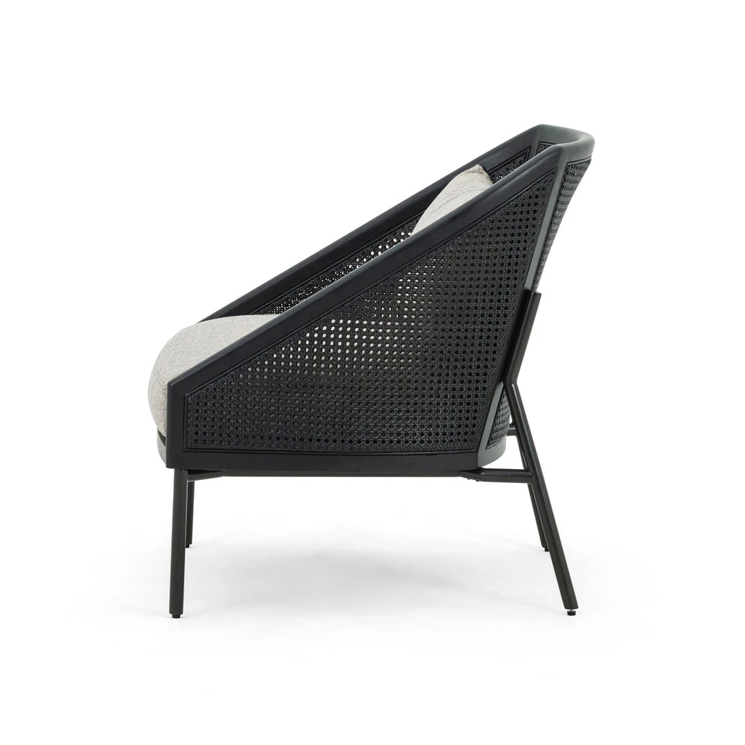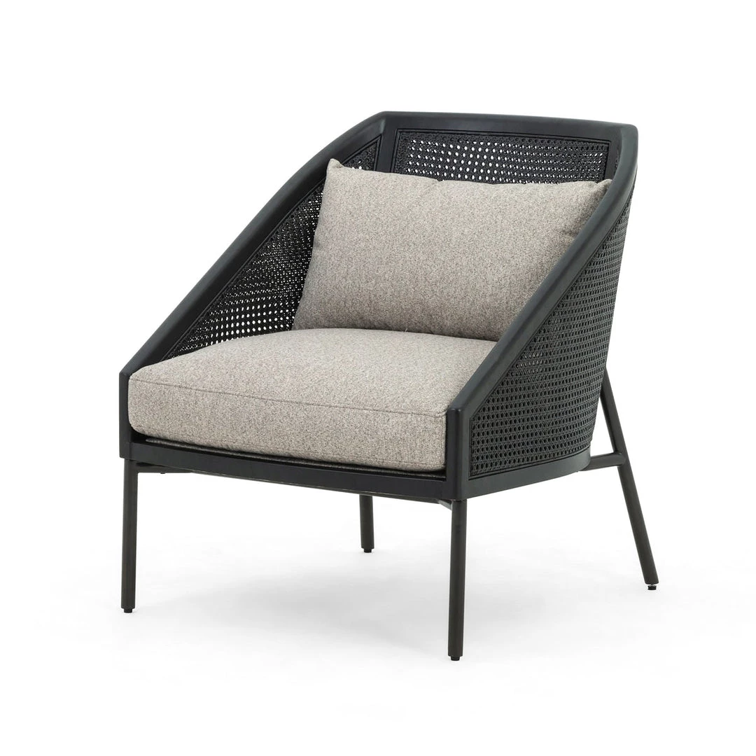The right angle. A modern, material-driven take on a classically sleek silhouette, slim iron legs and textural black rattan, framed out by solid FSC-certified rubberwood. With plush feather-blend cushioning for guaranteed comfort. Perfect for a covered patio.