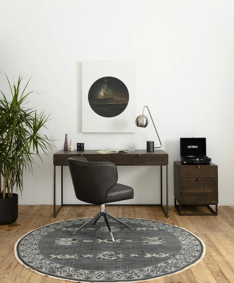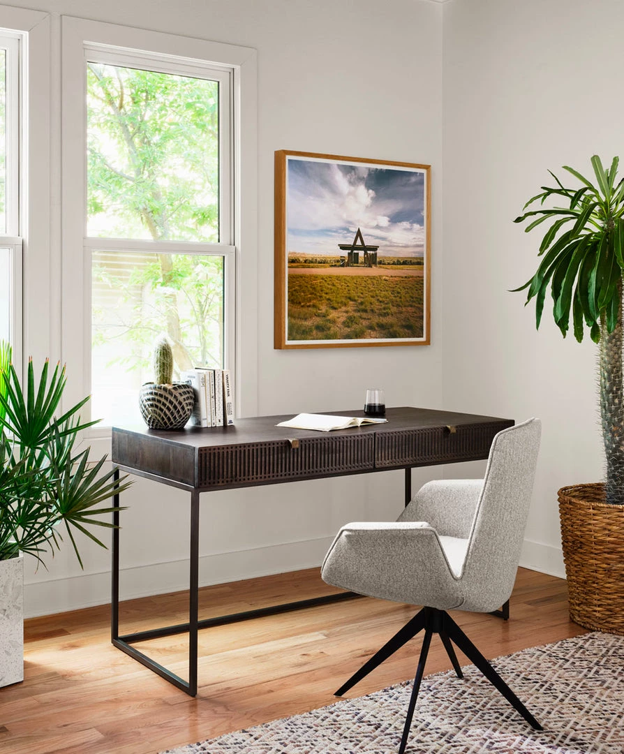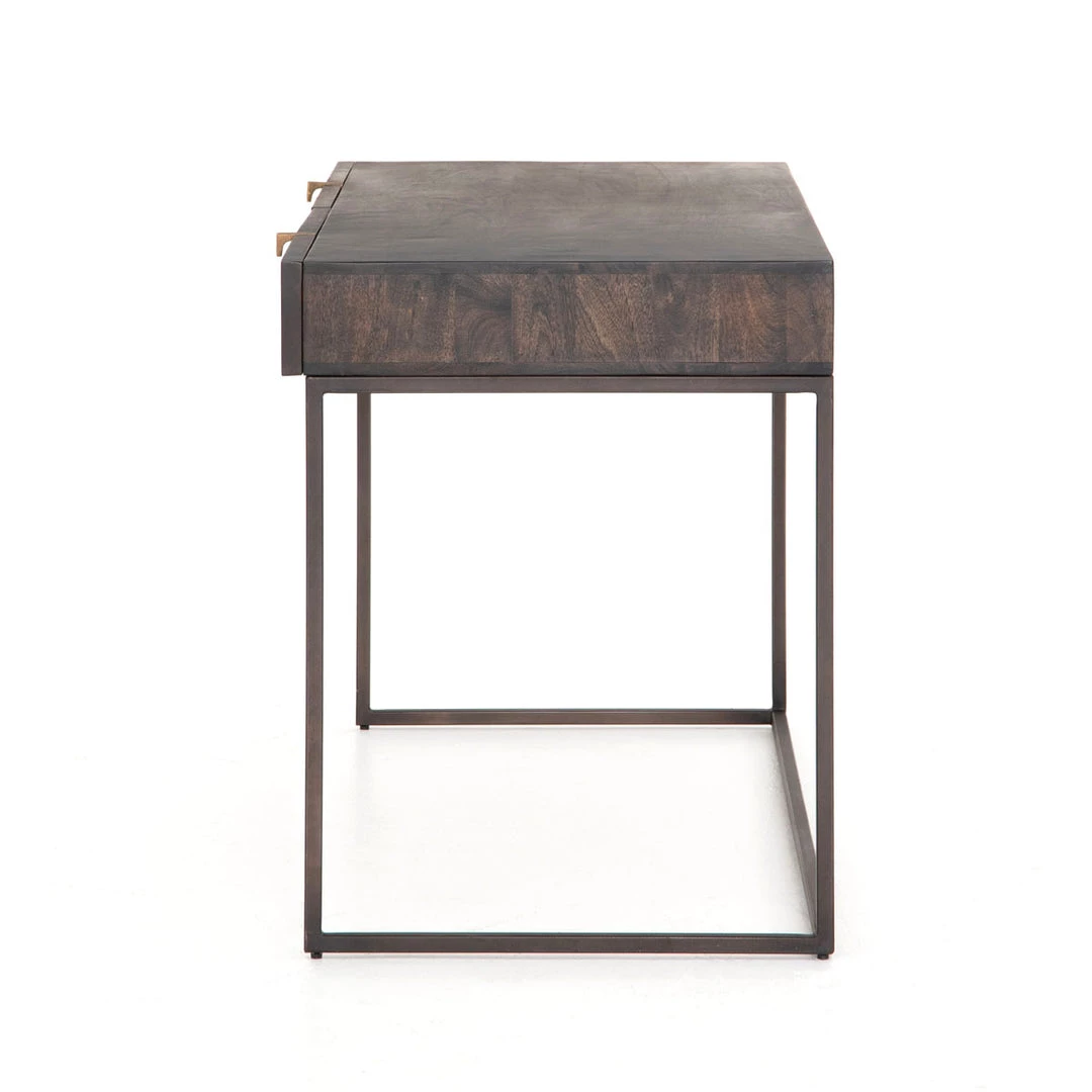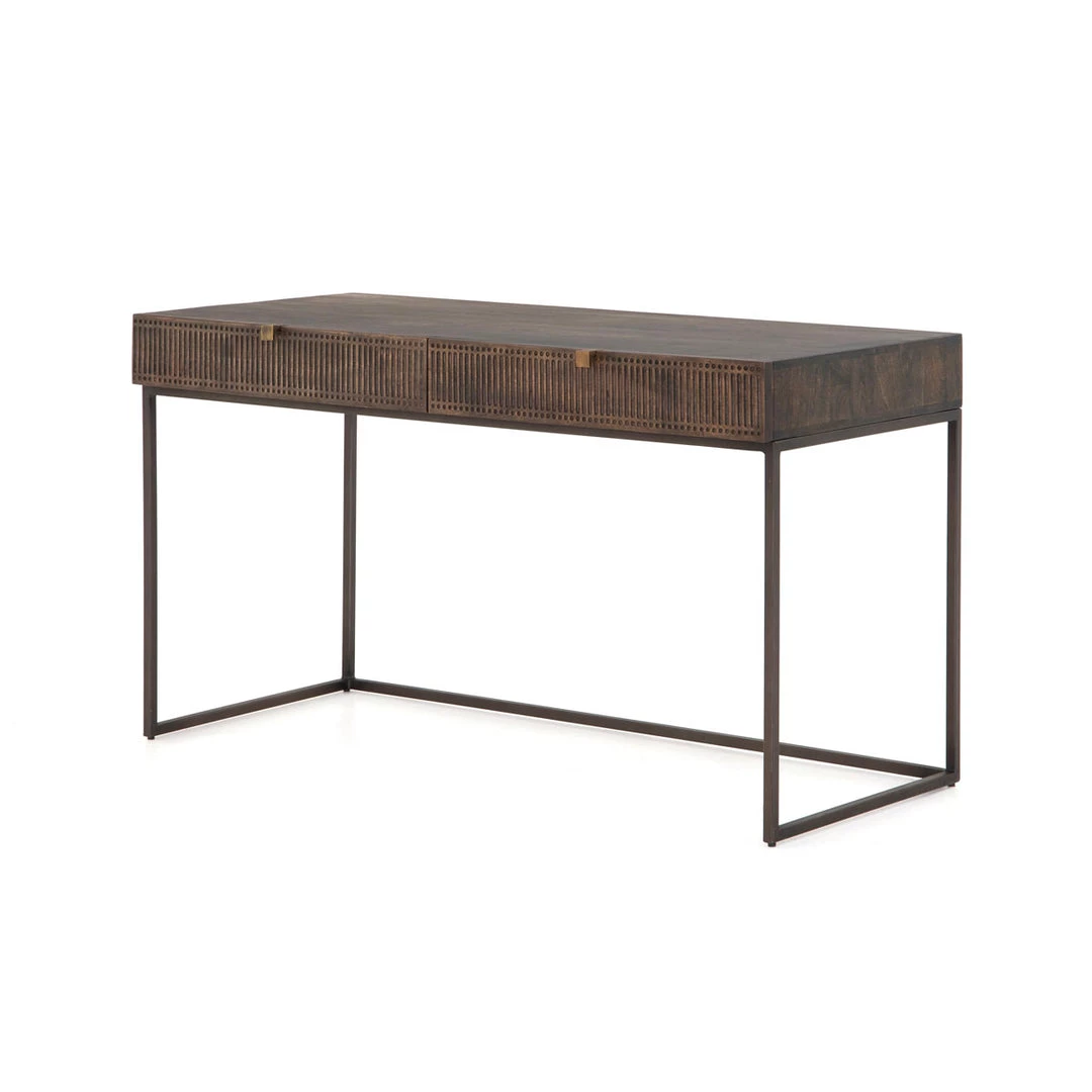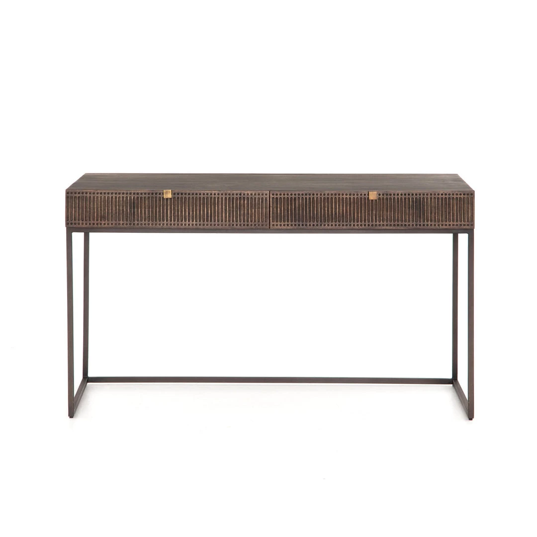 Unique linear carving meets fresh dimension with an artisan slant. Mango wood casing is finished in a vintage brown, highlighting texture and high craftsmanship. A slim iron base adds a long, airy look, while dual drawers keep desk necessities on hand.