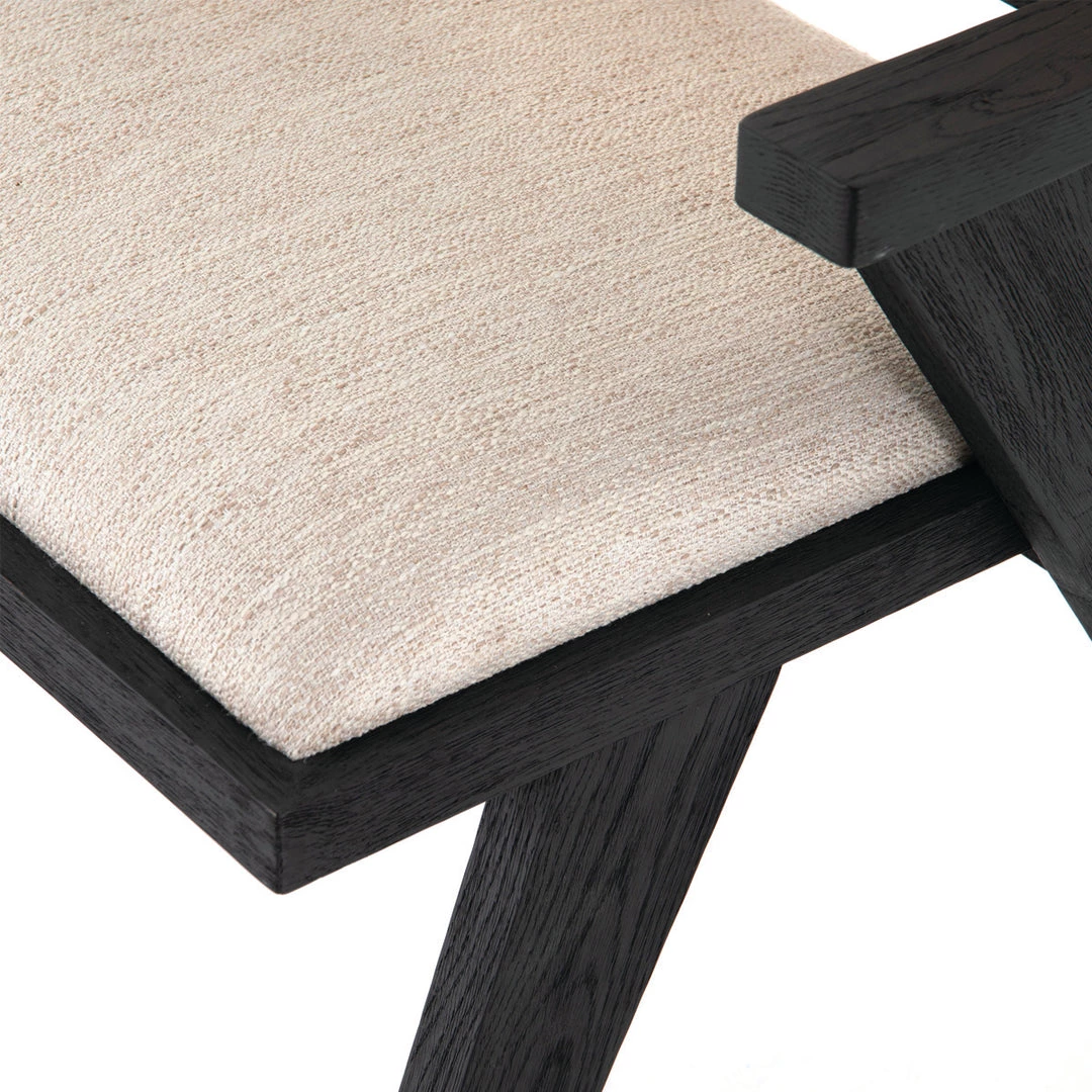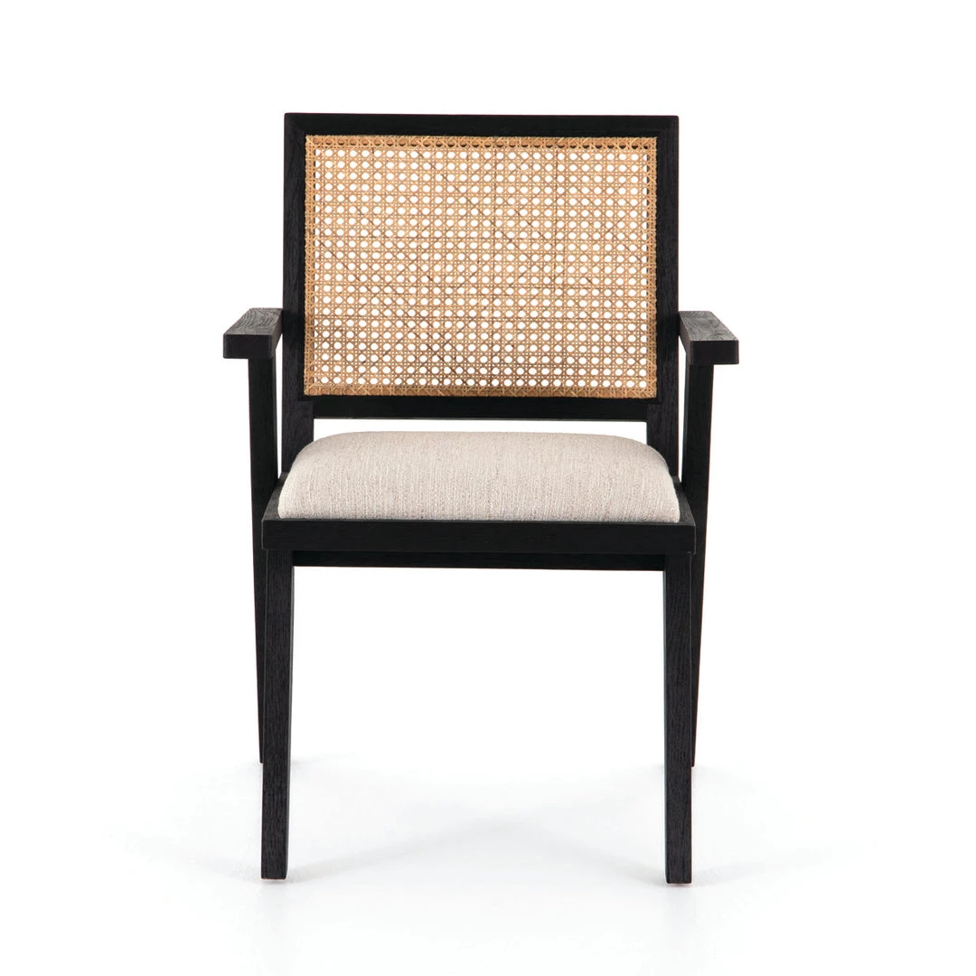 The Kingman Dining Chair blends materials and textures to create an inviting look for your dining room. The dining chair frame is made of black-finished oak with an upholstered on the seat and woven cane backrest creating a mid-century modern feel.