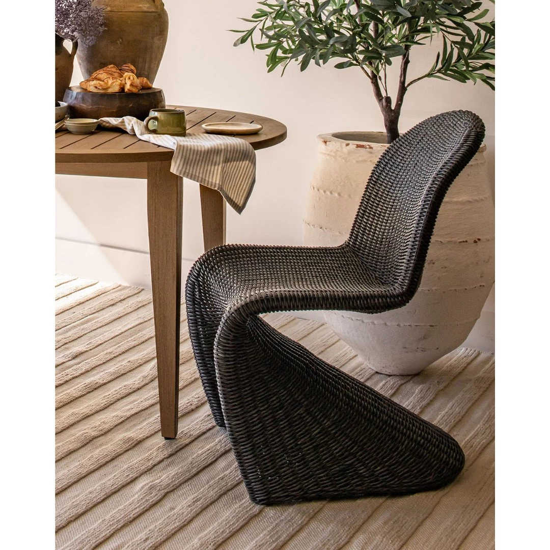 A shapely take on outdoor seating. This vintage wicker chair takes a curvey form in order to add unique lines and an intriguing element to your outdoor dining space. Cover or store indoors during inclement weather and when not in use.