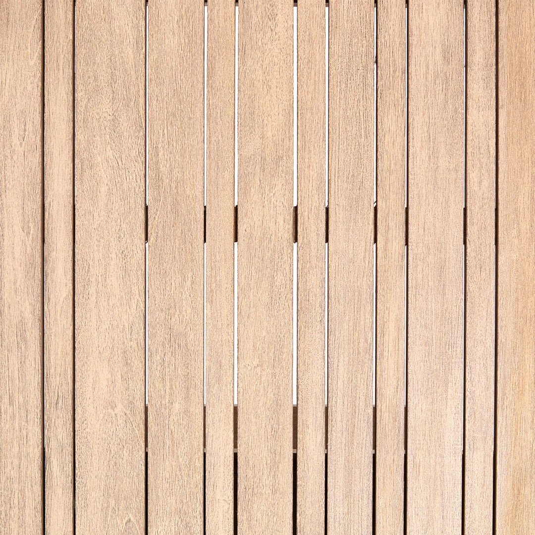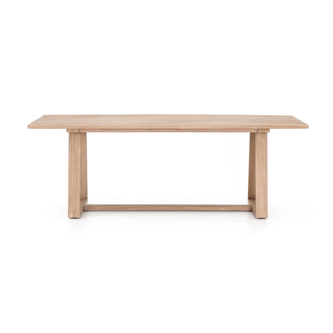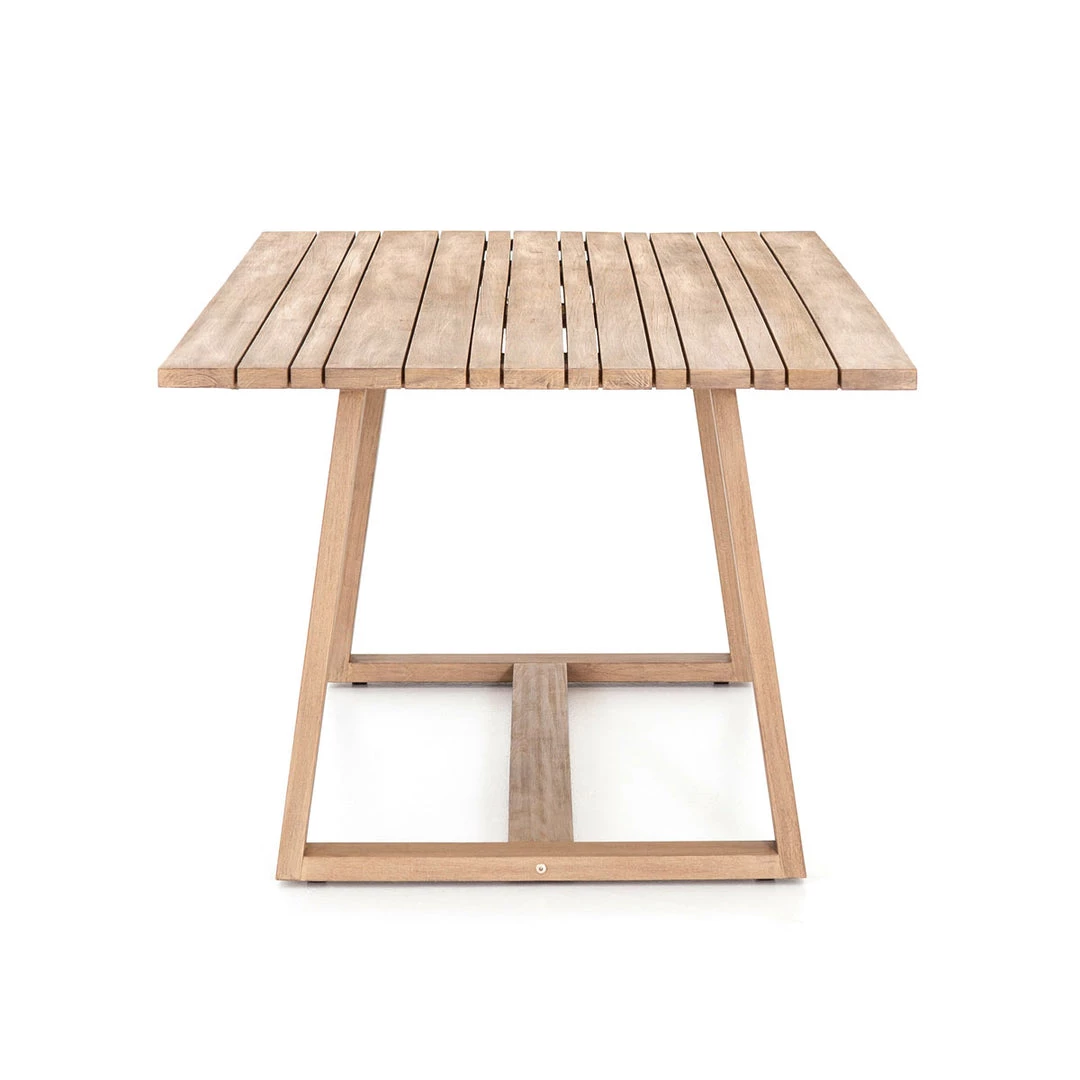 An angular base brings architectural appeal to the dining table. Planks of weathered grey teak provide plenty of tablespace, perfect for outdoor entertaining. Cover or store indoors during inclement weather and when not in use.