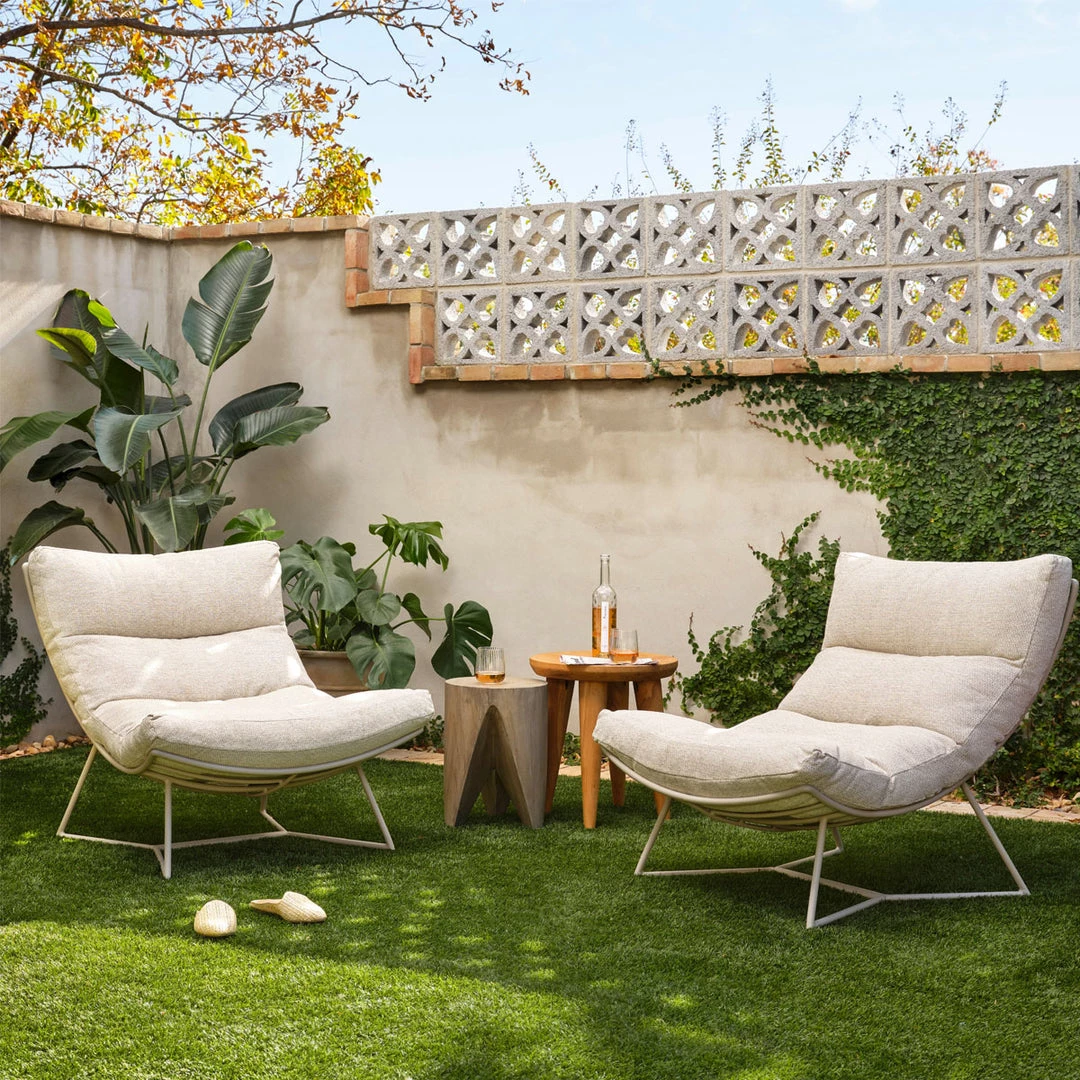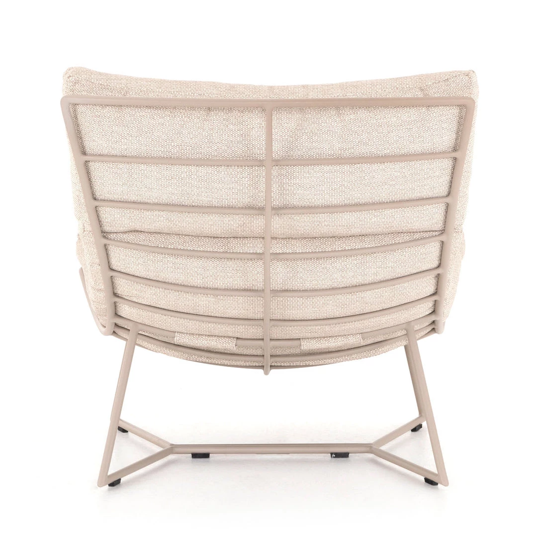 An slim pitched design, modernized for outdoor use. The Parker Chair sits low and curved, with a single removable cushion for cleaning ease. Slate-finished aluminum framing with ladderback detailing and open legs adds an angular touch. Cover or store indoors during inclement weather and when not in use.