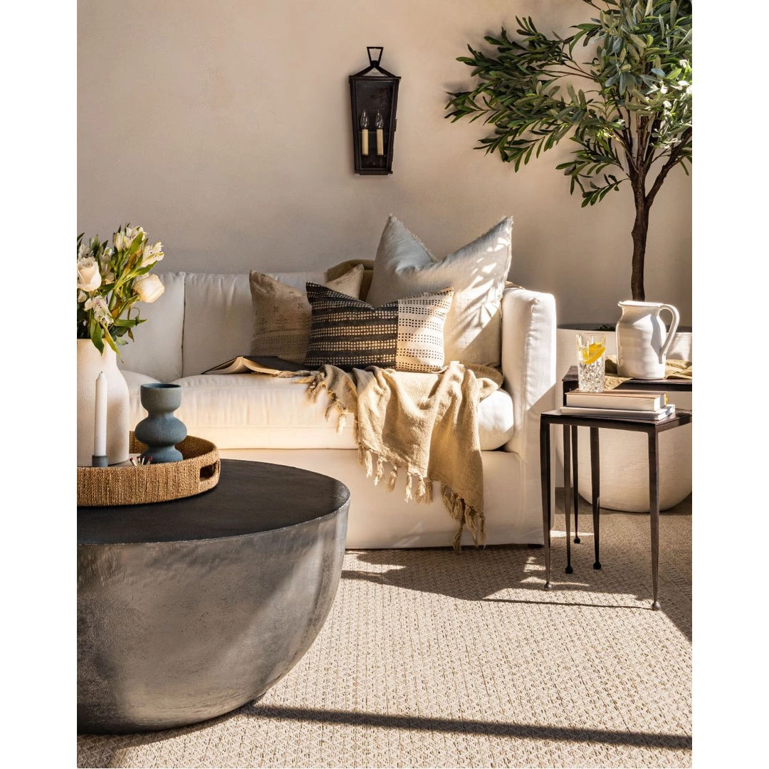 An aged grey finish forms a rounded silhouette for a sleek modern look. The simple large and moody coffee table invites guests indoors or out. Cover or store inside during inclement weather and when not in use.