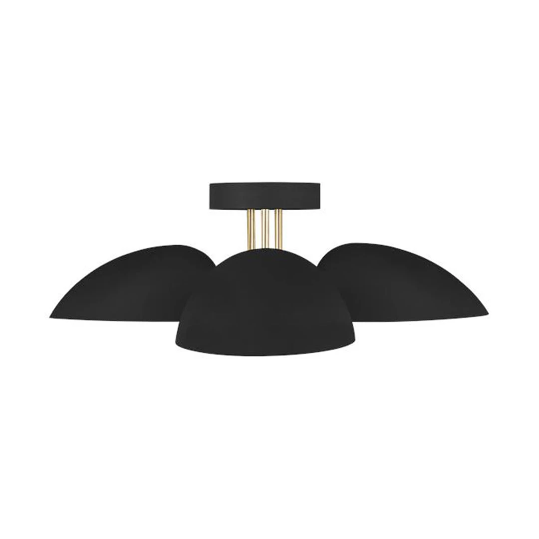 The three lamp London Flush Mount light has burnished brass arms with your preference of either matte white or midnight black glass shades.