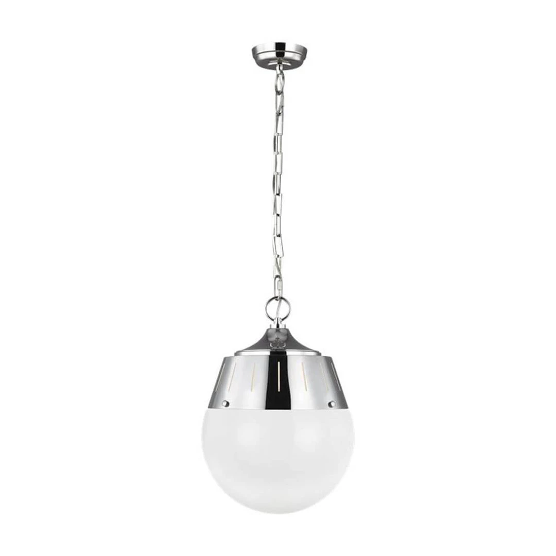 The Volos Pendant is a hanging ceiling light. The pendant holder is available in a variety of finishes with studded detailing and the spherical glass pendant will light up your room.