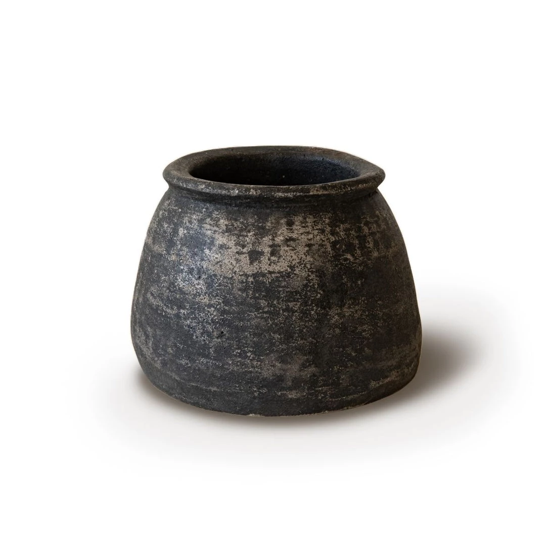 Handcrafted and age-worn, each jar is unique and antique looking. Maia Vases are short, round pieces of pottery, that comes in a black finish. Use vase to display fresh flowers by placing a glass of water at the base of the jar with the flower arrangement within.