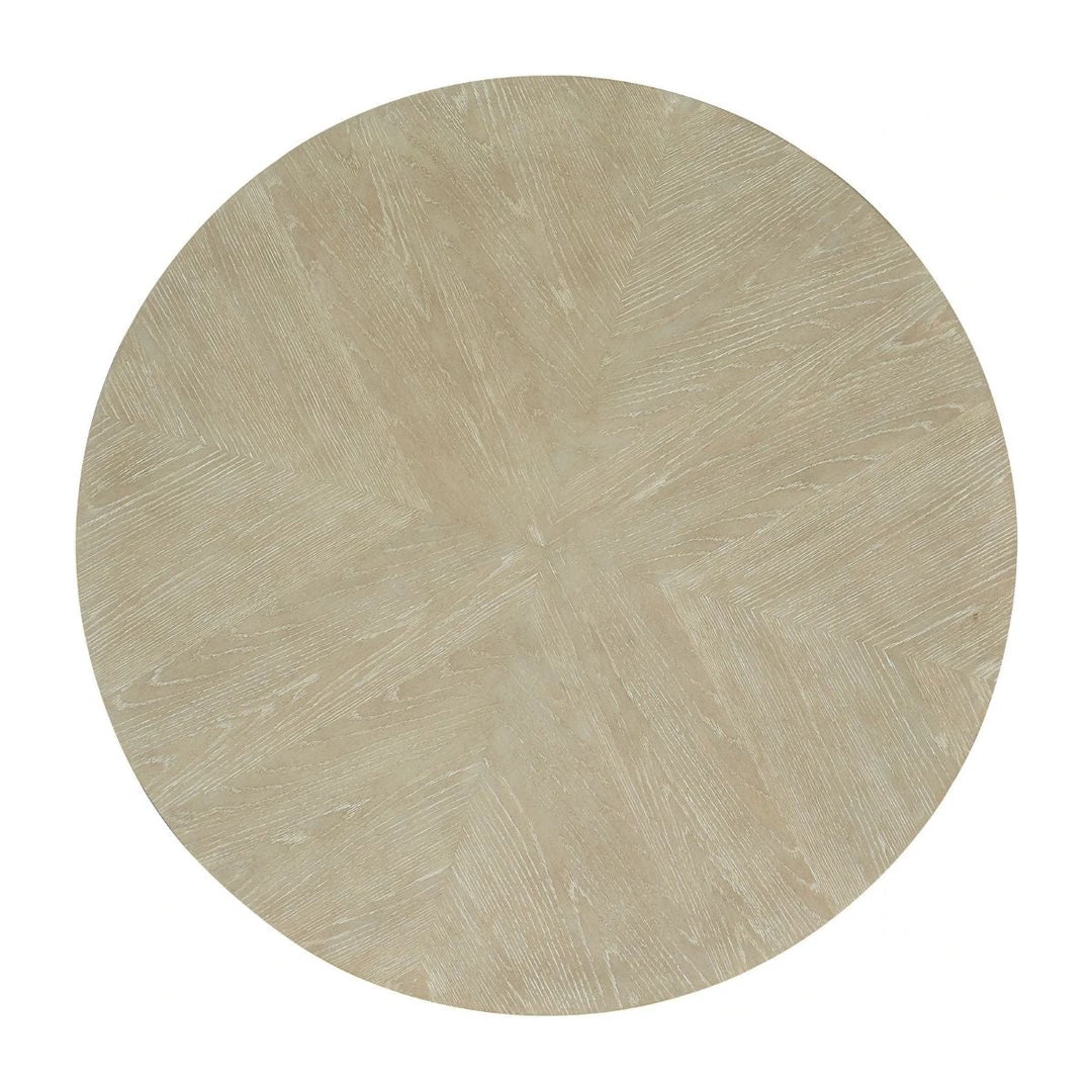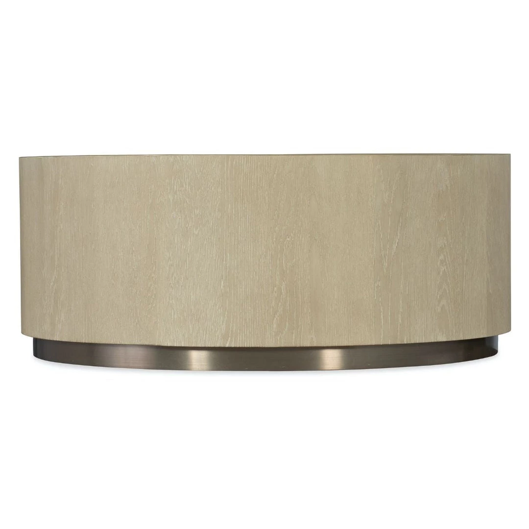 The Granville Coffee Table has a natural modern look with its smooth finish and round shape. The timeless silhouette in an oak veneer and taupe finish is paired with a champagne metal base. A stunning table to gather around with friends and family.Â