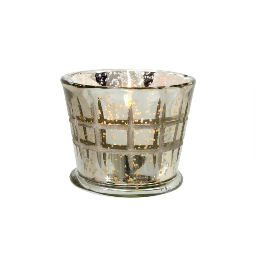 Add a touch of sparkle with the Check Cuts Votive. The silver-finished glass piece will add a glow when paired with a candle upon a tabletop or shelf.
