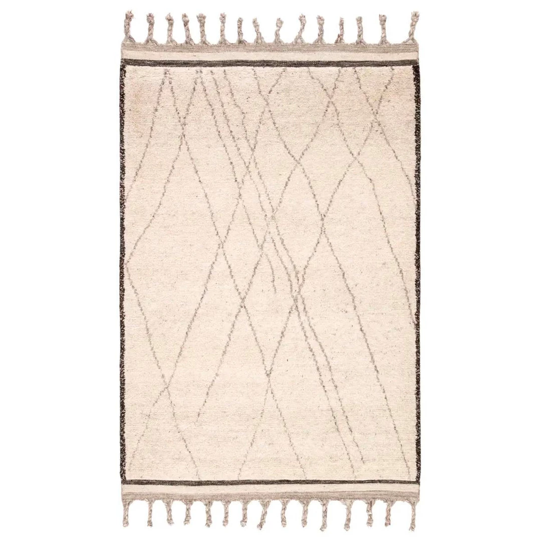 The Aldea Ivory/Black Rug is a modern take on Moroccan styling. This artisan hand-knotted 100% wool rug boasts a plush pile with a visually intriguing classic tribal trellis and large braided tassels.Â