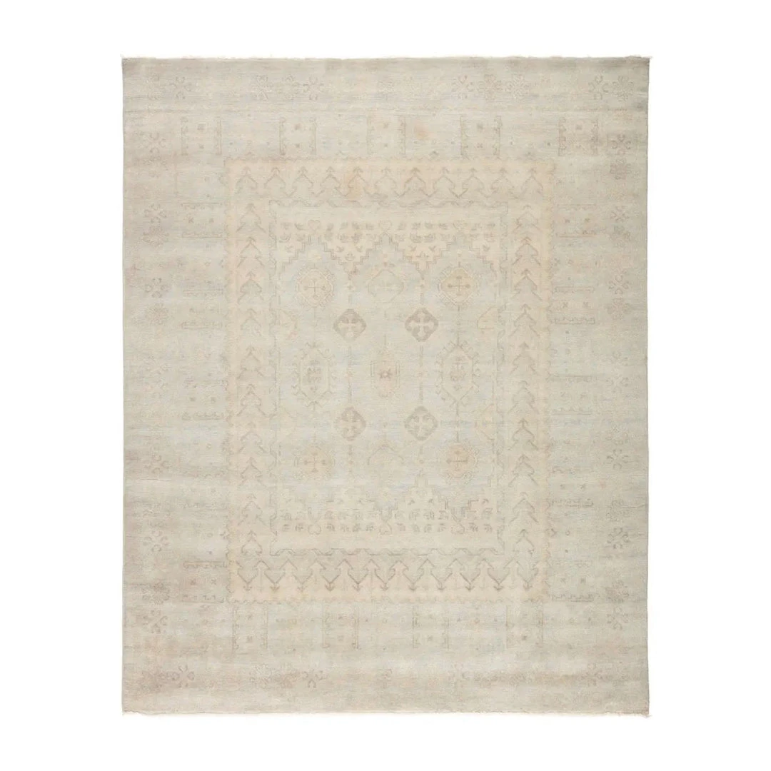 The Saturna collection emanates traditional elegance, lending a soft and serene look to transitional homes. This area rug features a washed vintage-inspired design in muted grey and beige tones. This hand-knotted wool rug grounds living spaces with a classic, stately look.