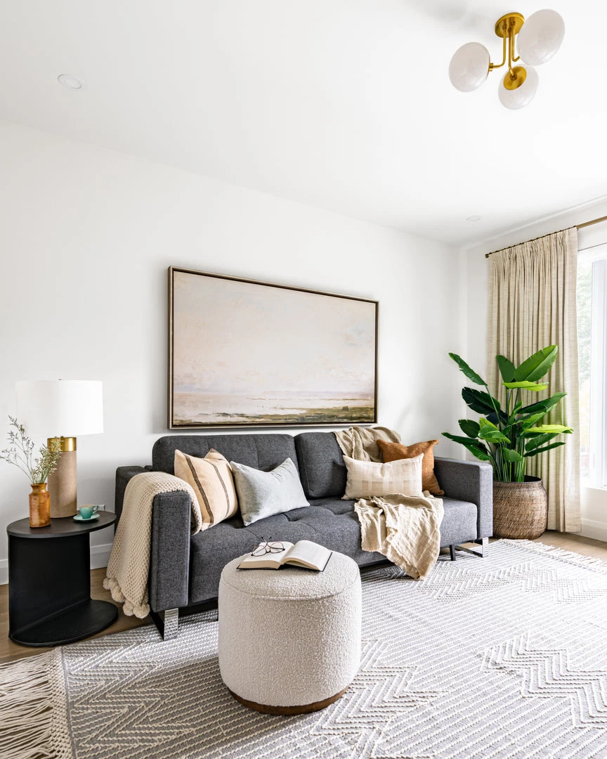 The Newton Rug features a relaxed asymetrical geometric design made with coils of textured yarn in ivory against a soft heathered grey background. This linear design is finished with textured macrame fringe. Expertly hand-woven in India, this luxurious rug will create a visual interest and feel for a comfortable interior.