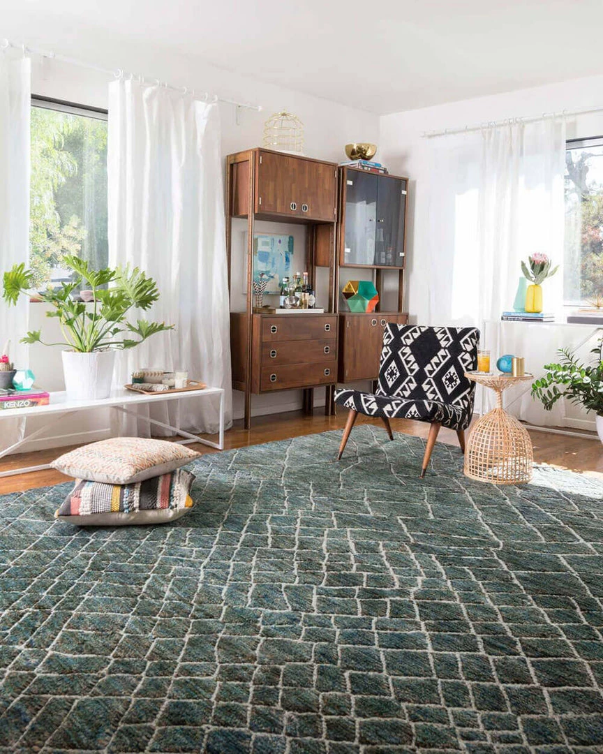 Inspired by nomadic Moroccan style the Sahara Mediterranean Rug will be sure to make a stylish statement. With gorgeous tones of blues, greens and browns this unique rug will have you looking down towards your feet. Hand-knotted in India of jute and wool, the jute is what creates the patterning in the rug design.