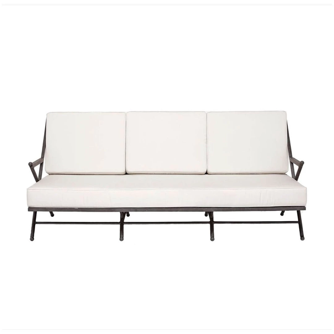 Modern materials ready a sophisticated silhouette for the outdoors. Metal forms a clean, wide frame for UV-resistant and water-repellent fabric. Can be paired with the Montague Lounge Chair for a full outdoor set. Cover or store inside during inclement weather and when not in use.
