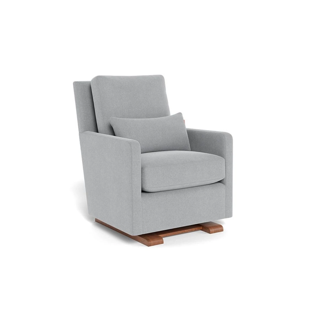 The Como Glider is soft and comfortable. Perfectly paired with the Como ottoman to sit back, put your feet up and relax. This Canadian handcrafted chair glides along a sleek, solid base. The cushions are filled with a down-like polyester filling for superior comfort. This glider comes in Nordic Grey with a Walnut base