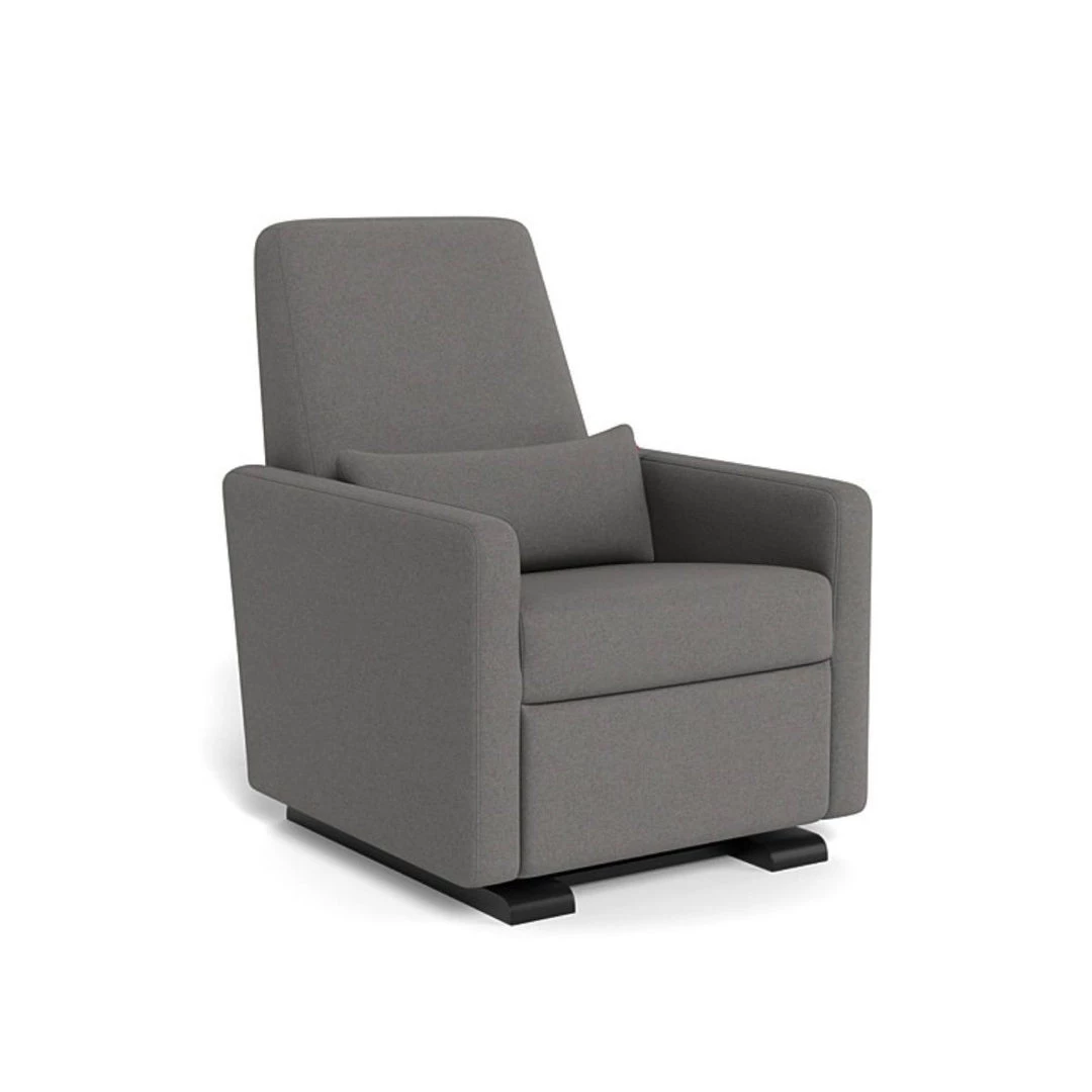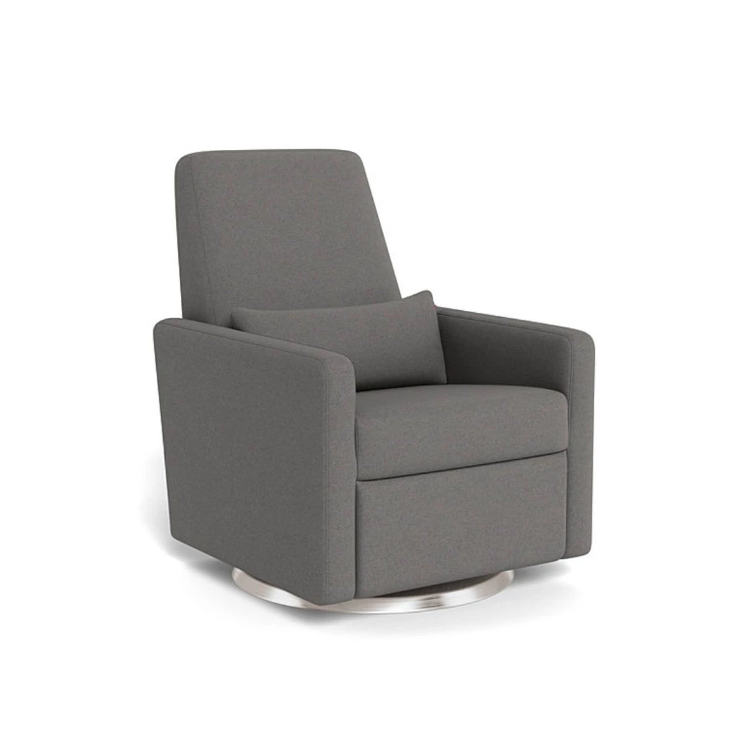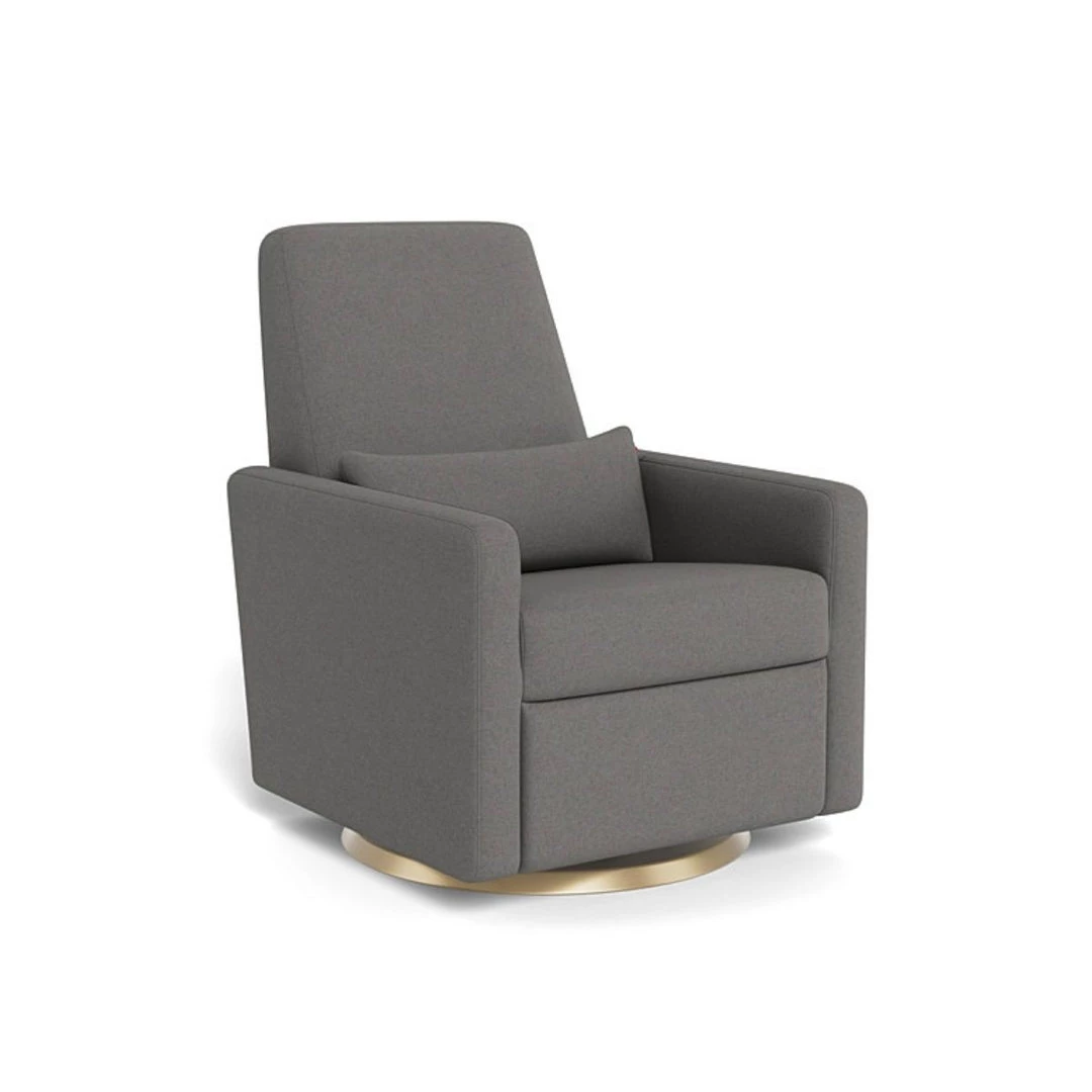 The Grano Glider Recliner is soft and comfortable. The reclining feature is perfect to sit back, put your feet up and relax. This Canadian handcrafted chair glides and swivels along a sleek, matte gold stainless steel base. The cushions are filled with a down-like polyester filling for superior comfort. This glider comes in many colour variations as well as two glider base options and two swivel base options.