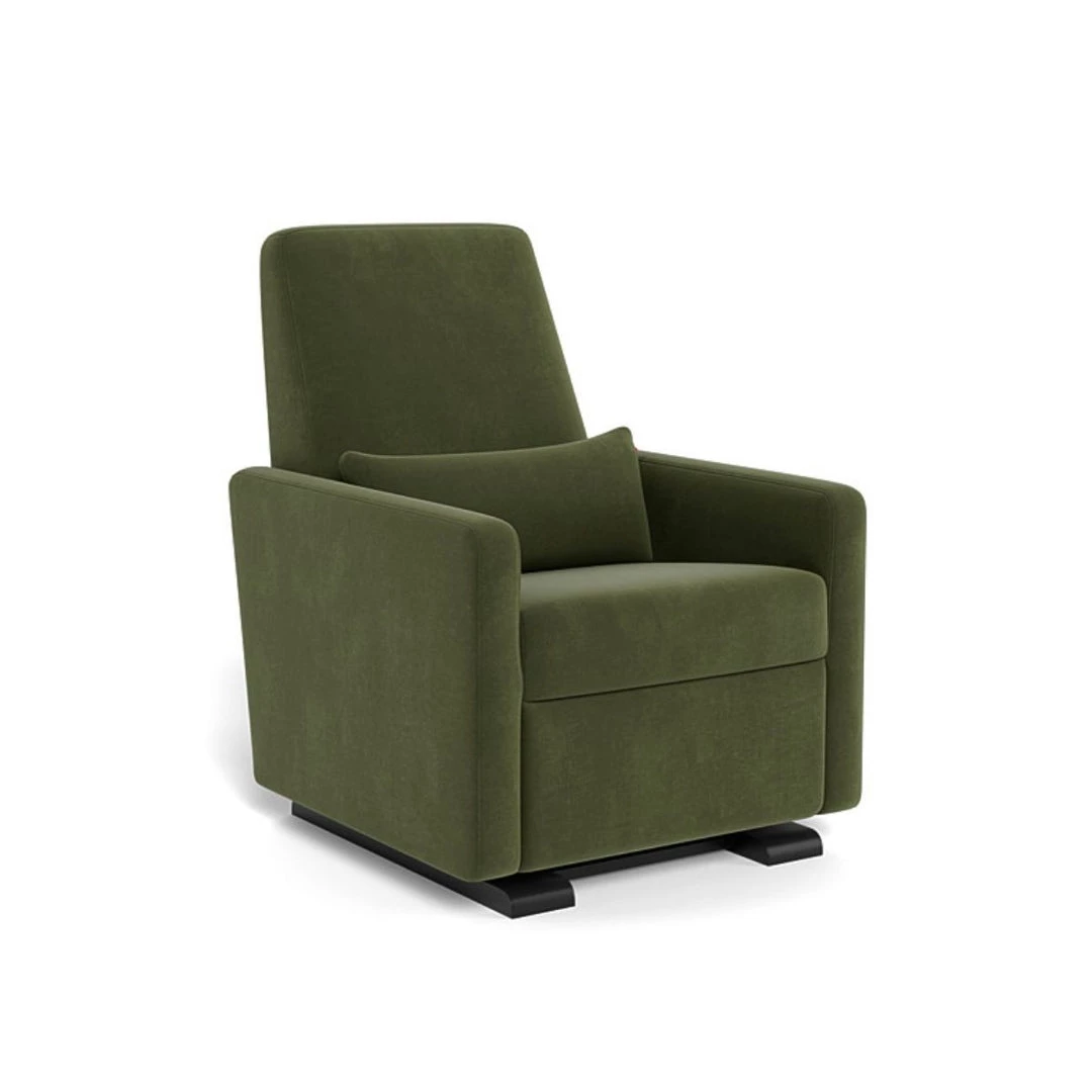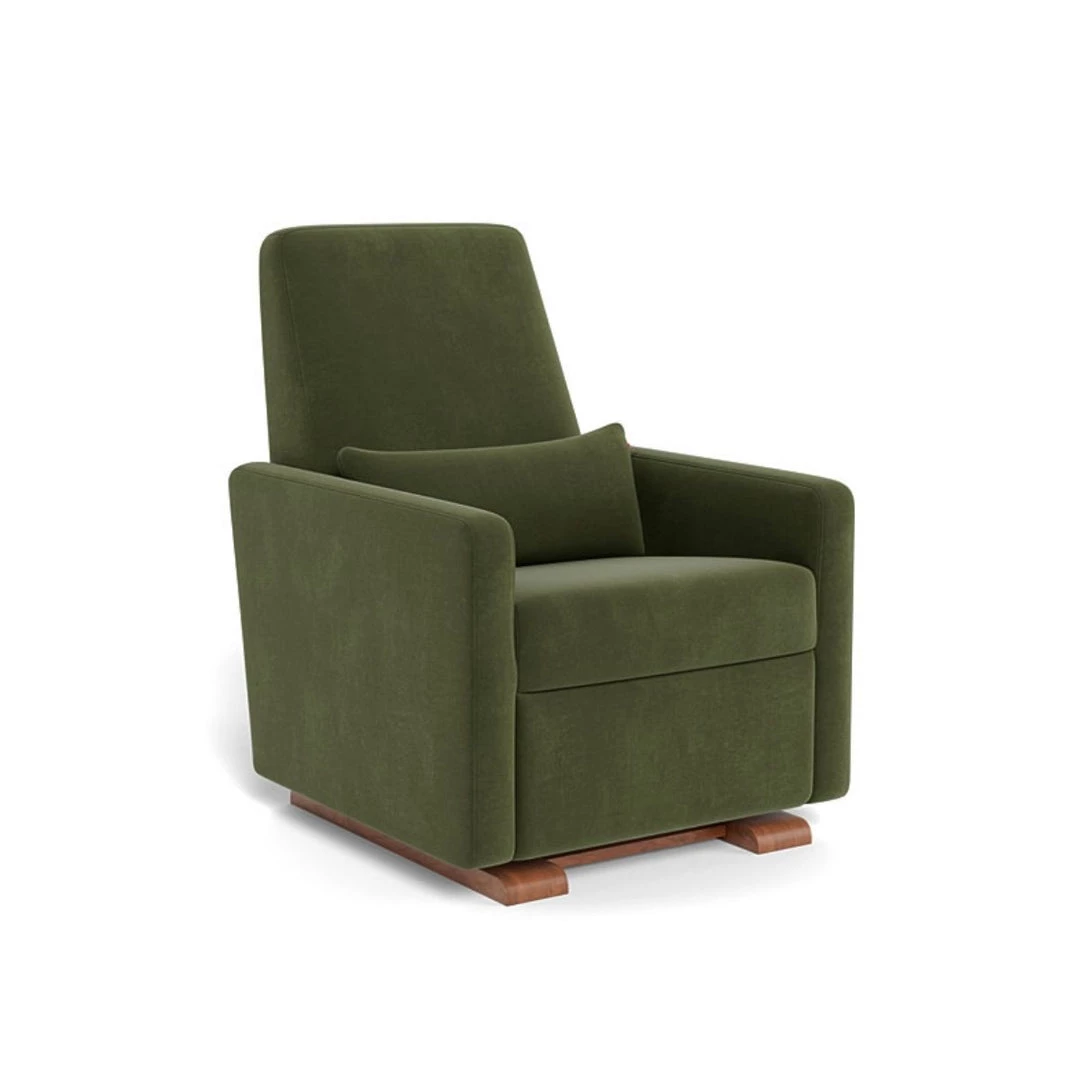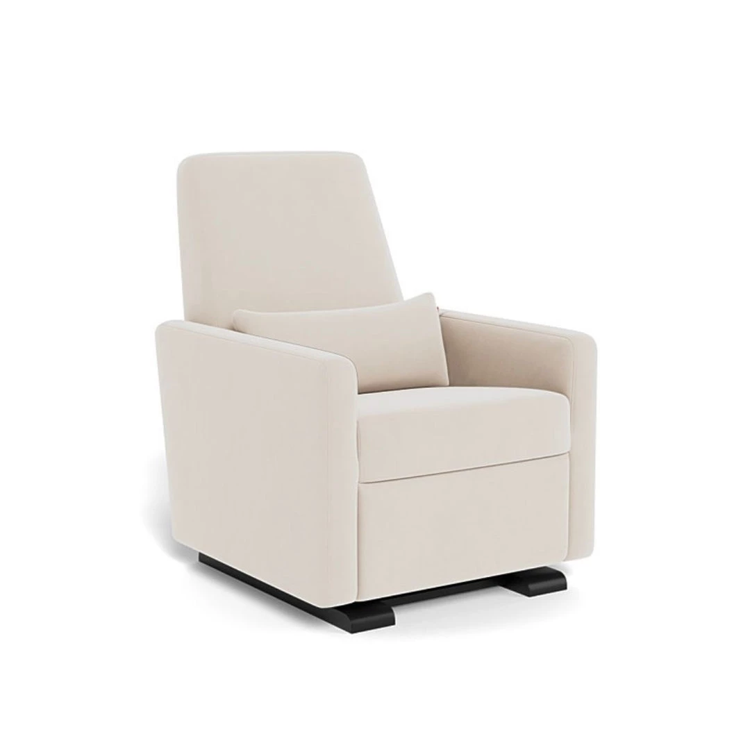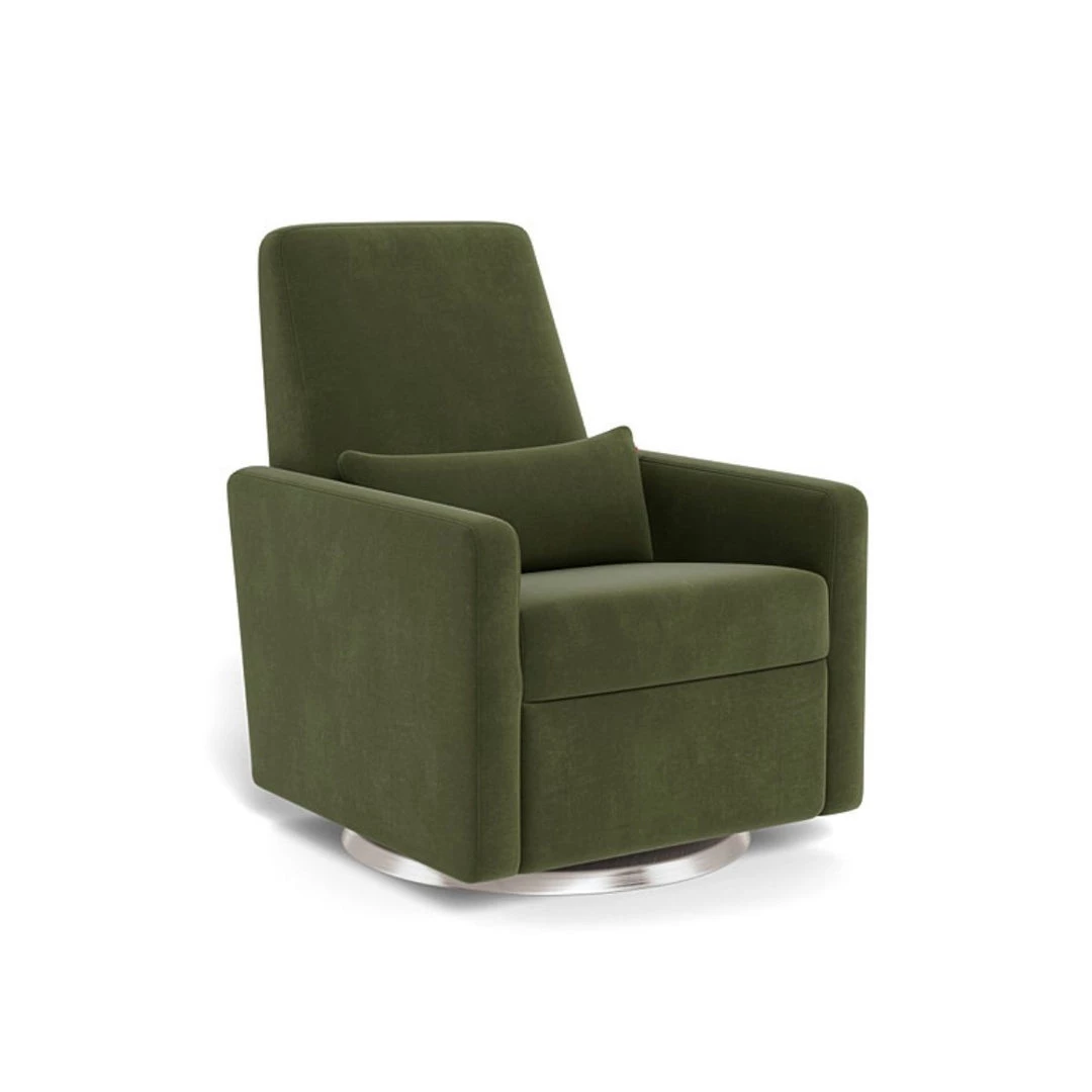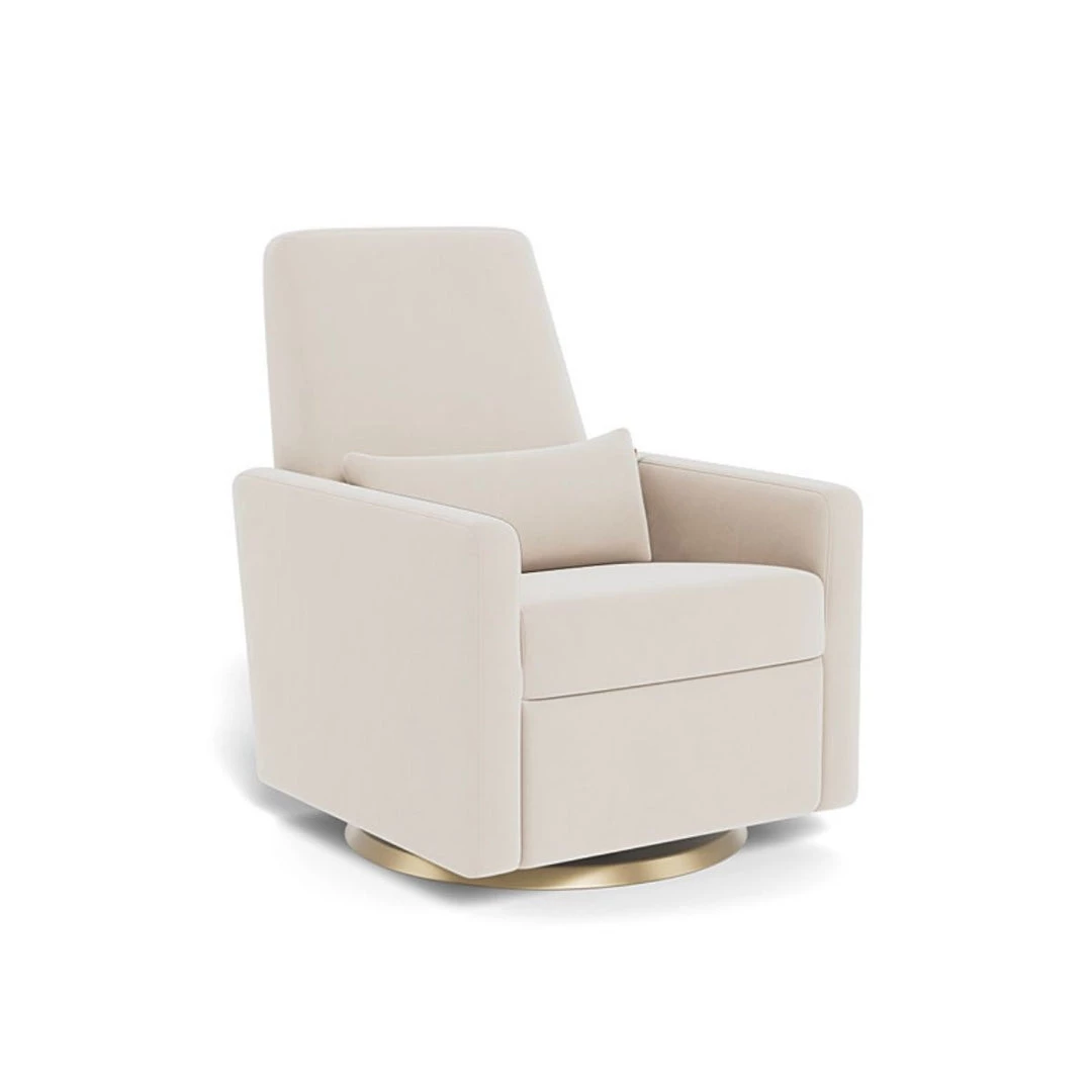 The Grano Glider Recliner is soft and comfortable. The reclining feature is perfect to sit back, put your feet up and relax. This Canadian handcrafted chair glides and swivels along a sleek, matte gold stainless steel base. The cushions are filled with a down-like polyester filling for superior comfort. This glider comes in many colour variations as well as two glider base options and two swivel base options.