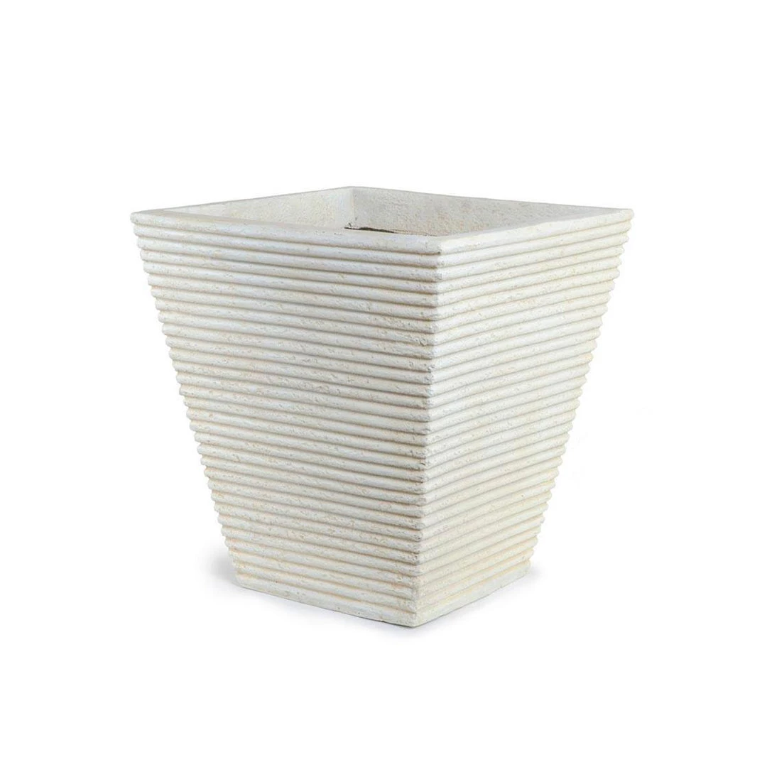 This square ribbed planter displays a soft cream colour which highlights the ribbed texture wrapping the entire planter. This planter’s versatility for both inside and outdoor use will enhance the dramatic tapering toward the large opening suitable for any tree plant.Â