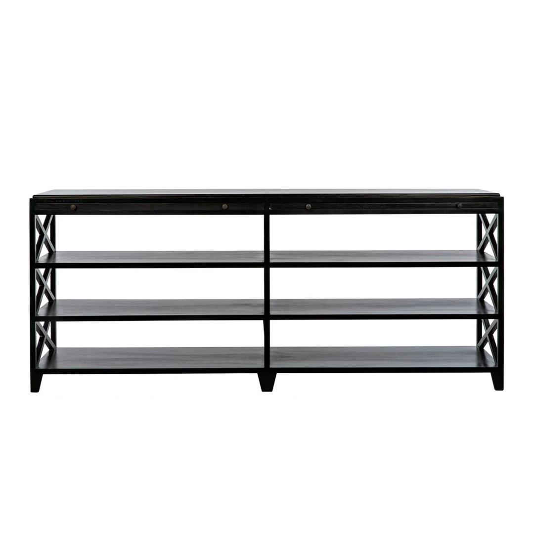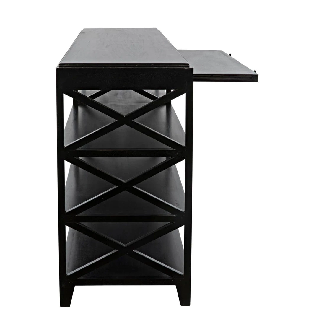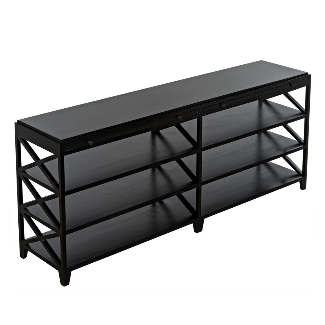 The Batumi Console Table is a sleek furniture piece with ample amounts of open storage. Combining black mahogany with angled details to create a sharp, yet balanced addition to your space.