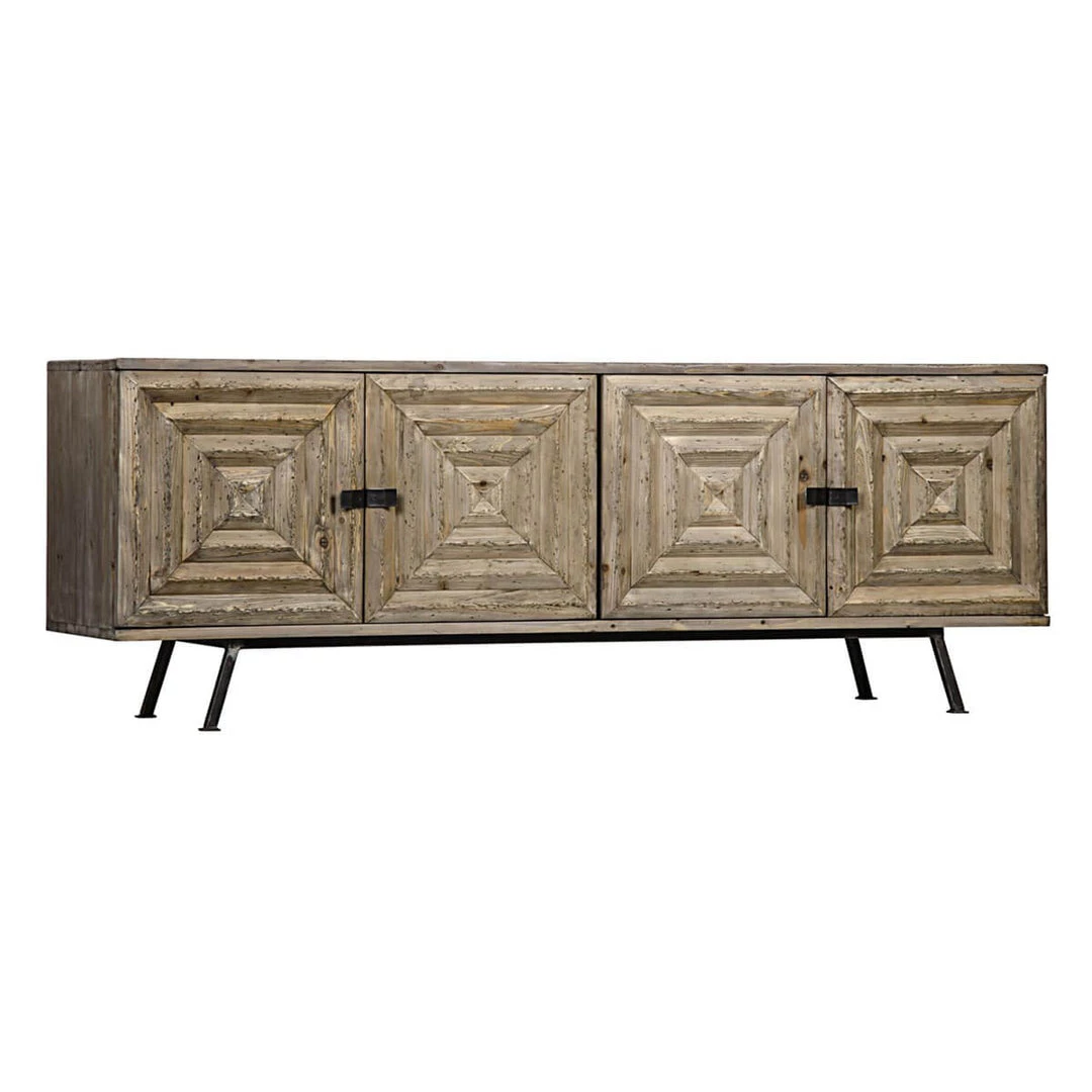 The Paria Sideboard has visual appeal with its geometrical four front doors. The fir wood has been finished with an old wood shade giving the Paria a well-loved, antique feel. The dark metal door hardware contrasts the wood and allows you to focus on the detailed doors.