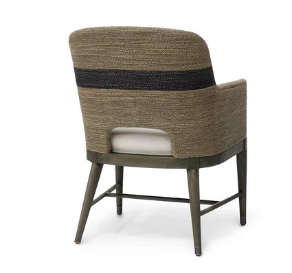 The Apia Dining Arm Chair pulls boasts a modern coastal look with its hand-twisted lampakanai roped back and sides in a grey finish with a sleek black stripe. An upholstered seat is fixed a top grey legs with pewter finish foot caps. This stunning chair will add impeccable style pulled up to your dining table, desk or conference table.