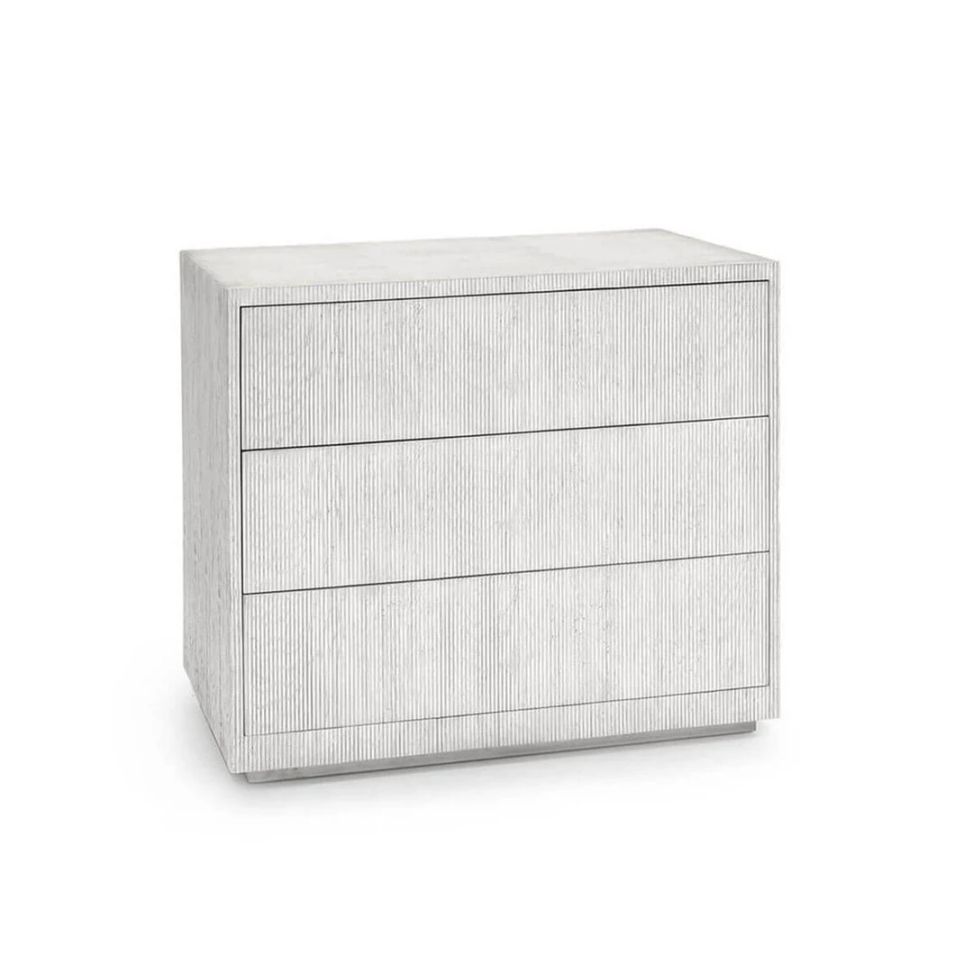The Goldsboro Nightstand is a solid hardwood frame accented with resin fibreglass reeded details on drawer fronts and a faux shagreen detail on the top. The Goldsboro is complete with a whitewash finish. The three drawers are equipped with a touch latch self-closing mechanism.
