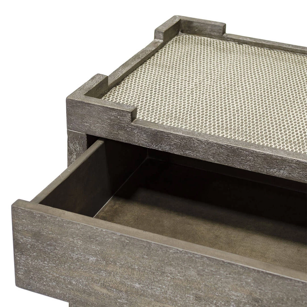 The Tillamook Side Table features a distressed hardwood frame with cane matting on top, shelf and outside sides.